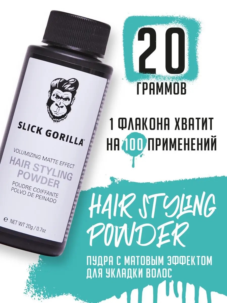 Чем хороша пудра Slick Gorilla? За счет матового финиша она абсолютно незаметна на волосах. Пудра-невидимка не оставляет блеска и белых следов, а также легко смывается. Сохраняет эффект свежей укладки весь день. Инновационный состав мгновенно схватывает форму и фиксирует ее надолго. Создает естественный объем. Пудра приподнимает волосы у корней, не утяжеляя и не склеивая их. Удобна в использовании. За минуту вы сможете сделать дома укладку как в барбершопе. Легкую упаковку можно брать с собой. Баночки 20 граммов хватает на несколько месяцев при ежедневном использовании. С ее помощью можно создать объем и подчеркнуть текстуру. Форму укладки можно менять под настроение. Продукт не тестируется на животных и не содержит парабенов. Для создания небрежной укладки нанесите пудру кончиками пальцев, для более выраженной ладонями.