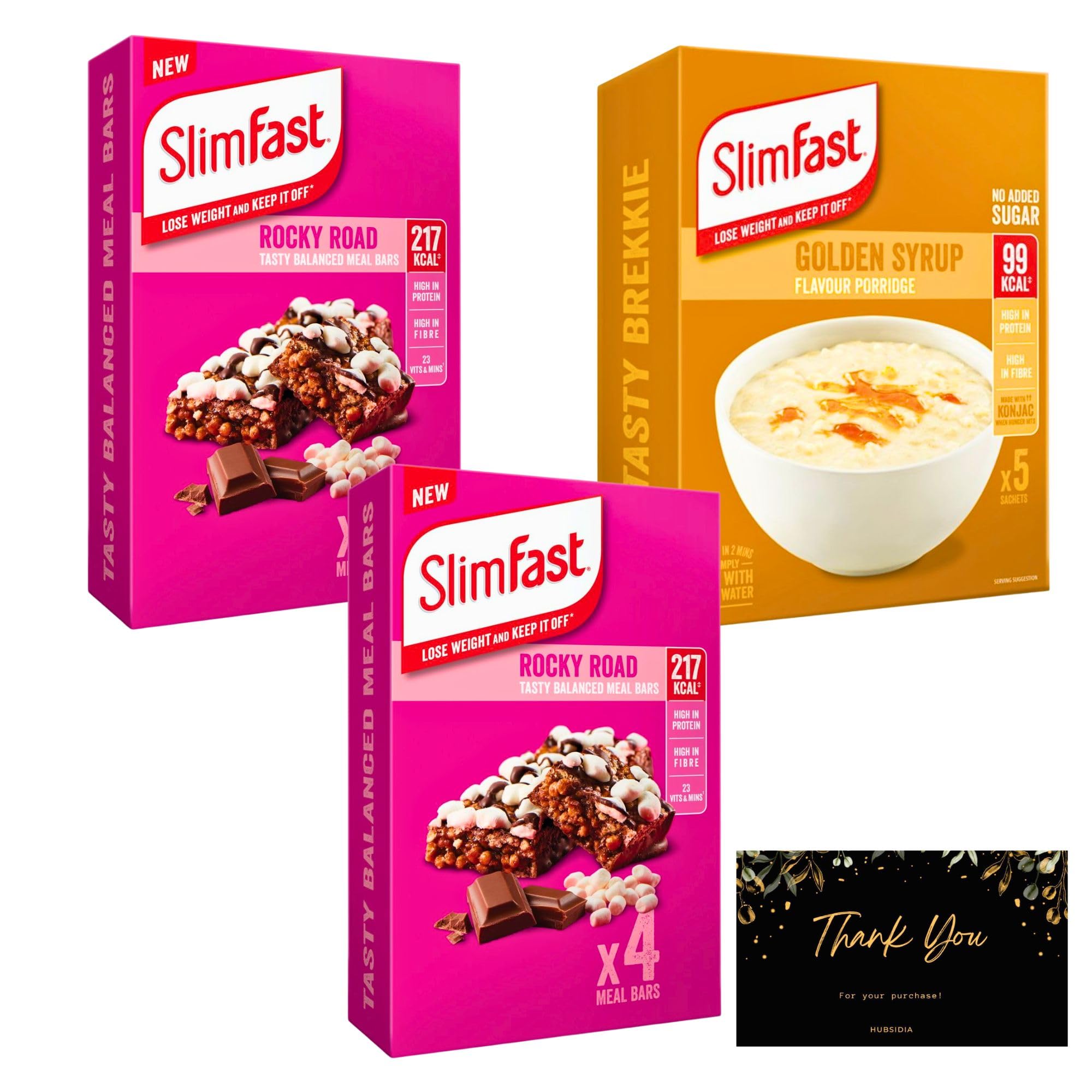 fiber, with 23 essential vitamins and minerals. Plus they fit perfectly in your bag for when you’re out. Slimfast Snacks Multipack: Featuring the best of Slim Fast Rocky Road Meal Bars and Slimfast Porridge Golden Syrup. These meal replacement bars are not just tasty but also designed to support your weight loss efforts effectively. On-the-Go Slimfast Meal Replacement: Stay fueled and focused wherever you go with Slimfast Bars - the ultimate meal replacement bars for weight loss. Slim Fast Porridge and Rocky Road Bars make it easy to stick to your diet plan, ensuring you get the nutrition you need on the move. Nutrient-Rich Slim Fast Snacks: Slimfast Porridge Golden Syrup, a wholesome and filling option to curb cravings. Combined with the delicious Slim Fast Rocky Road Meal Bars, this bundle offers a convenient way to stay on track with your weight loss journey. Effective Weight Loss Bundle: Achieve your weight loss goals with the Slimfast Meal Replacement Bundle, featuring 1 x Slimfast Porridge Golden Syrup(5x29g) and 2 x Slim Fast Rocky Road Meal Bars (8x60g), with Hubsidia Thank you Card- a perfect combination of tasty and nutritious meal replacement options.