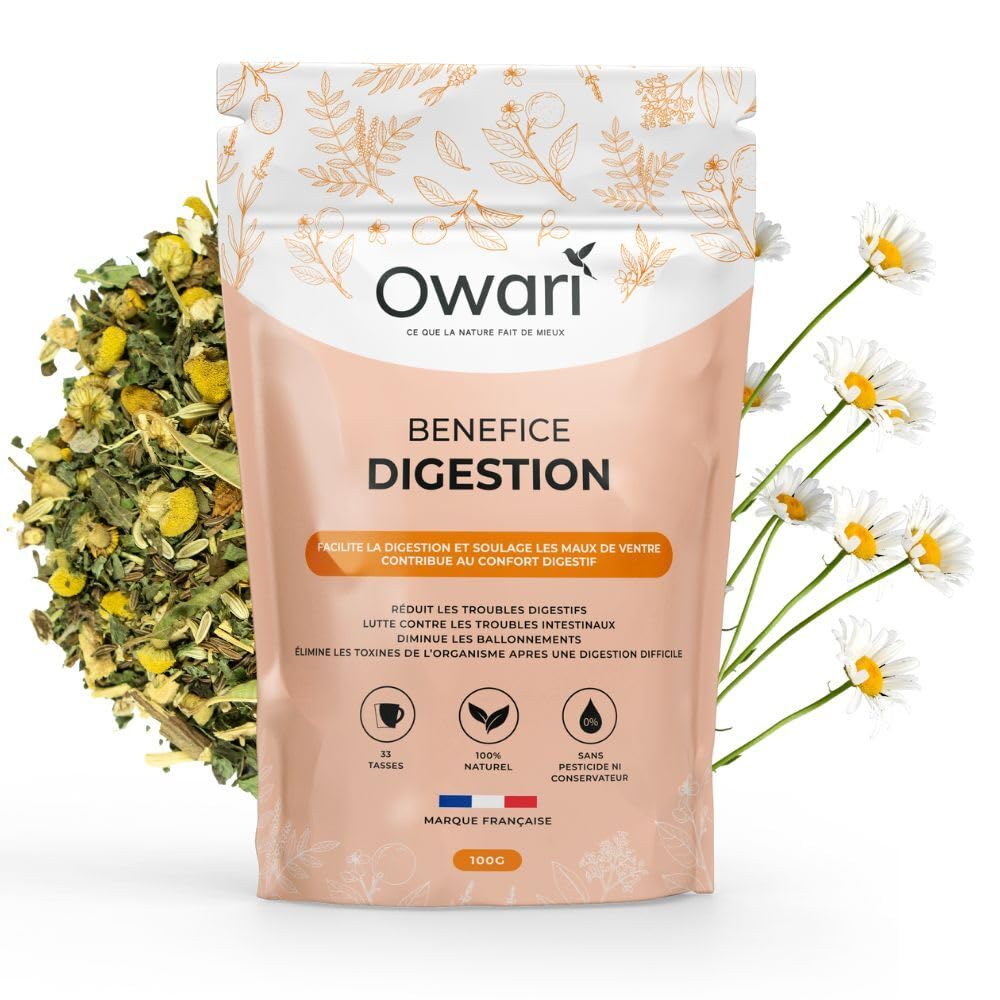 SAY GOODBYE TO DIGESTIVE DISCOMFORT DURING CERTAIN MEALS! Do you suffer from bloating, abdominal cramps, flatulence, or inflammation? These digestive issues are uncomfortable, embarrassing, and sometimes painful. Thanks to its combination of active ingredients, OWARI's DIGESTION BENEFIT acts on the digestive system, allowing you to regain soothed digestion and regular bowel movements. INGREDIENTS Caraway, Fennel, Chamomile, Lemon Balm, Mint, Licorice Root, Dandelion, Rosemary, Verbena INSTRUCTIONS Bring 200 ml of water to a boil. Add 1 teaspoon (3 grams). Let it steep at 95 C for 5 minutes. Pour the mixture into a cup. Wait a few minutes before drinking (it's hot). See more