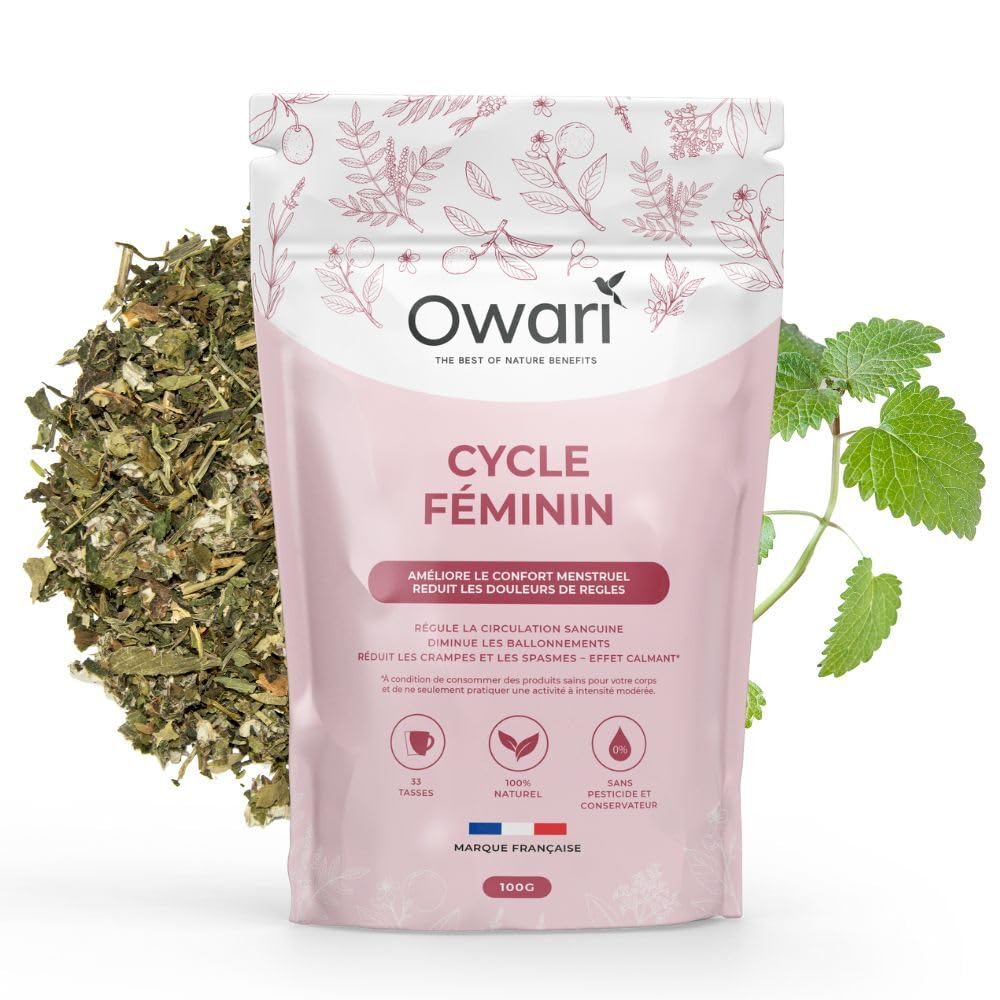 EXPERIENCE YOUR MENSTRUAL CYCLE WITHOUT FEAR Do you suffer from terrible cramps in your lower abdomen, extreme fatigue, digestive problems.? To relieve all these ailments, our team of OWARI experts has selected plants that will have real benefits for your menstrual cycle. During heavy periods, OWARI's FEMININE CYCLE treatment will promote better blood circulation and help you combat fatigue. At the same time, its calming effect will reduce bloating, as well as certain cramps or spasms felt in the uterus, abdomen, or muscles. INGREDIENTS Nettle, Horsetail, Lion's Foot, Raspberry Leaves, Yarrow, St. John's Wort, Lemon Balm INSTRUCTIONS Add one teaspoon of Feminine Cycle to 200 grams of water at 95 degrees Celsius for 8 minutes. SAFETY WARNING Pregnant or breastfeeding women should consult a healthcare professional before consuming this product. See more