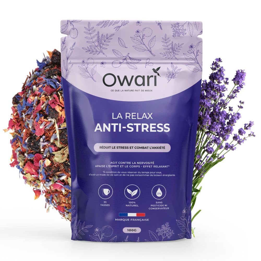 ON THE ROAD TO SERENITY Do you sometimes feel exhausted and anxious? Rest assured, you're not alone in having a personal or professional life that leaves you little time to breathe. Of course, we don't all experience or manage it in the same way. But we didn't invent anything new before the advent of modern medicine, the majority of people on planet Earth treated themselves solely with plants. That's why we've specially designed a combination of plants for the OWARI RELAX ANTI-STRESS treatment to combat anxiety and the effects of stress. With a touch of added expertise. INGREDIENTS Natural Rooibos Green Rooibos Lemon Balm Rose Petals Lavender Aronia CornflowersMADE IN FRANCE: At Slim'Tea, we want to contribute to your well-being, help you feel better in your body, and all in a natural way. Slim'Tea is a French brand the treatment is 100 natural and packaged in France. Directions for use: Bring 200 ml of water to a boil. Add 1 teaspoon (3 grams). Let it steep at 95 C for 5 minutes. Pour the mixture into a cup. Wait a few minutes before drinking it (it's hot). NATURAL, HIGH-QUALITY INGREDIENTS: - Horsetail, Birch leaves, Nettle, Rosehip, Anise, Fennel, Verbena, Licorice root. Why am I effective? Natural Rooibos: boosts energy. Green Rooibos: boosts energy while protecting the immune system. Lemon balm: combats nervousness by soothing spasms and improving sleep. Rose petals: combats nervousness, improves digestion, and promotes regularity. Lavender: combats nervousness and insomnia. Aronia: improves blood circulation, protects the immune system, and fights inflammation. Cornflower blossoms. My role in addressing your stress problems: Improves relaxation, eliminates stress, combats nervousness, soothes the mind and body, provides a relaxing effect, soothes spasms, and improves sleep.OWARI LA RELAX - Anti-stress - Combat l'anxiété - Réduit le stress - Agit contre la nervosité - Effet relaxant - Thé en vrac 100g - Boisson 100 NaturelleDESCRIPTION DU PRODUIT DESCRIPTION DU PRODUIT EN ROUTE VERS LA SERENITE Vous vous sentez parfois épuisé, anxieux(se) ? Rassurez vous, vous n'êtes pas le la seul(e) avec une vie personnelle ou professionnelle qui ne vous laisse que peu le temps de souffler. Certes, nous ne le ressentons ni le gérons tous (tes) de la même manière. Mais nous n'avons rien inventé, avant l'arrivée de la médecine moderne la majorité des gens sur la planète terre se soignait uniquement avec des plantes. C'est pourquoi, nous avons spécialement conçu, pour la cure RELAX ANTI STRESS de chez OWARI, une combinaison de plantes pour lutter contre l'anxiété et les effets du stress. Avec une poignée de savoir-faire en plus. INGRÉDIENTS Rooibos naturel Rooibos vert Mélisse Pétales de rose Lavande Aronia Fleurs de bleuetMADE IN FRANCE : Chez Slim'Tea, nous souhaitons contribuer à votre bien-être, vous aider à vous sentir mieux dans votre corps et tout ça de manière naturelle. Slim'Tea est une marque française, la cure est 100 naturelle et conditionnée en France. Conseils d'utilisation Portez à ébullition 200 ml d'eau Ajoutez 1 cuillère à café (3 grammes) Laissez infuser à 95 C pendant 5 minutes Versez la préparation dans une tasse Attendez quelques minutes avant de la boire (c'est chaud). INGREDIENTS NATURELS, DE QUALITÉ: - Prêle Feuilles de bouleau Ortie Cynorrhodon Anis Fenouil Verveine Racine de réglisse. Pourquoi je suis efficace? Rooibos naturel : booste l'énergie, Rooibos vert : booste l'énergie tout en protégeant le système immunitaire. Mélisse : agit contre la nervosité en apaisant les spasmes, en améliorant le sommeil Pétales de rose : agit contre la nervosité, améliore la digestion et favorise le transit. Lavande : agit contre la nervosité et l'insomnie. Aronia : améliore la circulation sanguine, protège le système immunitaire et lutte contre les inflammations. Fleurs de bleuet. Mon rôle face a vos problèmes de stress: Améliore la détente Élimine le stress Agit contre la nervosité Apaise l'esprit et le corps Effet relaxant Apaise les spasmes Améliore le sommeil.