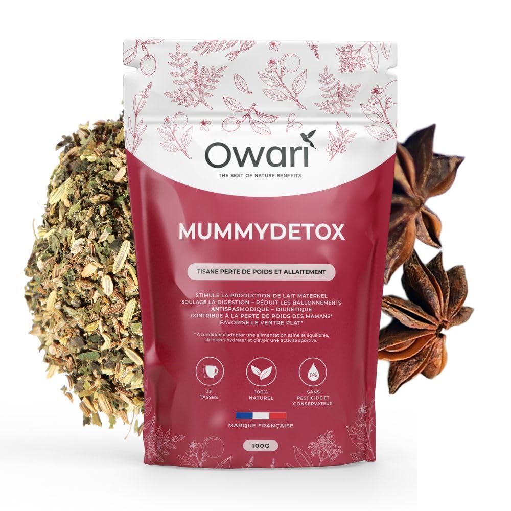 Did you think detox products were only for non-breastfeeding women? Think again! Being a breastfeeding mother is wonderful, but it's not always easy. Sometimes milk production isn't always consistent and can be insufficient. MUMMY DETOX from OWARI is the infusion that will support your weight loss while stimulating your milk production. It will have a diuretic effect while reducing bloating, resulting in a flatter stomach! This breastfeeding-friendly detox product is a blend of natural plants whose active ingredients positively impact lactation.MADE IN FRANCE: At Slim'Tea, we want to contribute to your well-being, help you feel better in your body, and all in a natural way. Slim'Tea is a French brand the treatment is 100 natural and packaged in France. IMPROVE YOUR POST-POSTPART WELL-BEING - this breastfeeding infusion comes in a 100g bag of loose-leaf herbal tea - enough for 33 cups of our detox tea. Simply add one teaspoon of Mummy Detox to 200 grams of water at 95 degrees Celsius for 8 minutes to enjoy the weight loss and breastfeeding benefits of our fennel, anise, caraway, and lemon balm infusion. 100 NATURAL INGREDIENTS: This fennel, anise, caraway, and lemon balm herbal tea is made entirely from 100 natural plant-based ingredients. This combination stimulates lactation, soothes digestion, reduces bloating, and helps new mothers with weight loss. Enjoy our natural herbal tea for postpartum mothers. ? EFFECTIVE: Our detox infusion is a breastfeeding fennel tea that will promote weight loss while stimulating milk production. It has a diuretic effect while reducing bloating, resulting in a flatter stomach! THE ONLY SLIMMING BREASTFEEDING INFUSION FOR MOMS: A detox herbal tea made with fennel, anise, caraway, and lemon balm, Mummy Detox offers a complete weight loss and breastfeeding solution for your postpartum kit.OWARI MUMMY DETOX - Tisane Allaitement - Infusion Avec Fenouil Pour Stimuler la Production de Lait Maternel - Tisane Allaitement Anti Colique Pour Post Accouchement - Tisane Vrac 100grDESCRIPTION DU PRODUIT Vous pensiez que les produits Détox n'étaient réservés qu'aux femmes non allaitantes ? Eh bien non ! Détrompez-vous ! Être une maman allaitante, c'est du bonheur mais ce n'est pas tous les jours facile. Il peut arriver que les montées de lait ne soient pas toujours au rendez-vous et parfois insuffisantes. MUMMY DETOX de chez OWARI est l'infusion qui va favoriser votre perte de poids tout en stimulant vos montées de lait. Elle va avoir un effet diurétique tout en réduisant vos ballonnements pour avoir à la clé un ventre plus plat ! Le produit Détox compatible avec l'allaitement est un assemblage de plantes naturelles, qui par leurs principes actifs agissent positivement sur la lactation.FABRIQUÉ EN FRANCE : Chez Slim'Tea, nous souhaitons contribuer à votre bien-être, vous aider à vous sentir mieux dans votre corps et tout ça de manière naturelle. Slim'Tea est une marque française, la cure est 100 naturelle et conditionnée en France. AMÉLIOREZ VOTRE BIEN-ÊTRE APRÈS ACCOUCHEMENT - cette infusion allaitement est fournie dans un sachet de 100 g de tisane vrac - soit 33 tasses de notre tisane detox. Ajoutez simplement une cuillère à café de Mummy Detox à 200 grammes d'eau à 95 degrès pendant 8 minutes pour profiter des avantages perte de poids et allaitement de notre infusion fenouil, anis, carvi, et mélisse. INGREDIENTS 100 NATURELS : la tisane fenouil, anis, carvi, et mélisse est composée entièrement des ingrédients végetaux 100 naturels. Cette combinaison stimule la lactation, soulage la digestion, réduit les ballonements et contribue à la perte de poids des nouvelles mamans. Profitez de notre tisane naturelle pour maman après accouchement. ? EFFICACE : notre infusion detox est la tisane fenouil allaitement qui va favoriser votre perte de poids tout en stimulant vos montées de lait. Elle va avoir un effet diurétique tout en réduisant vos ballonnements pour avoir à la clé un ventre plus plat !. LA SEULE INFUSION ALLAITEMENT MINCEUR POUR MAMAN: une tisane detox composée de fenouil, anis, carvil, et mélisse, le Mummy Detox vous offre une solution perte de poids et allaitement complète pour votre kit post accouchement.