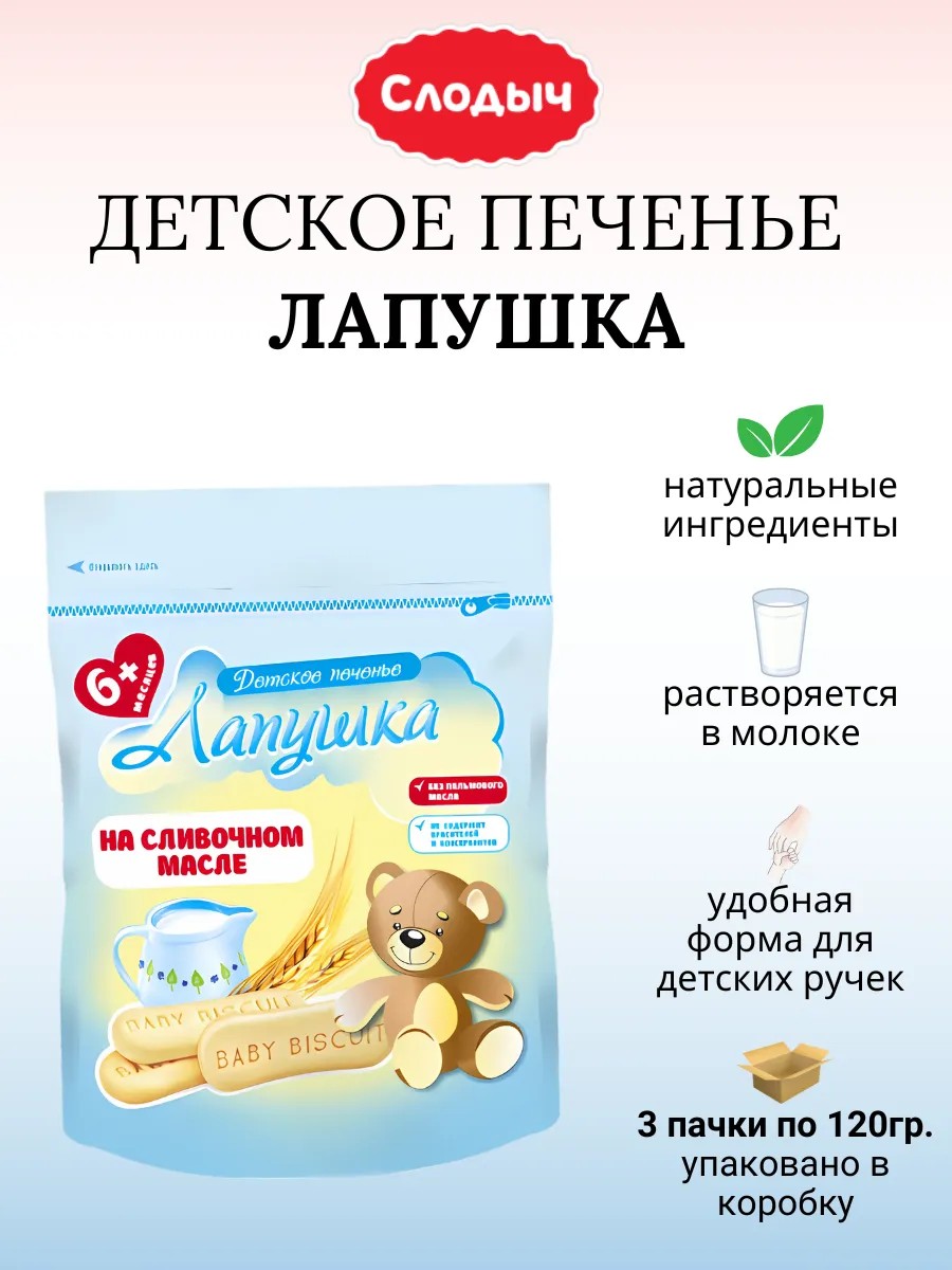 Родители всегда ответственно подходят к выбору сладостей для детей. Особенно хочется баловать совсем маленьких крошек. Слодыч создаёт специальное детское печенье ЛАПУШКА классическое сливочное масло, которое можно грудничкам от 6 месяцев! Кстати, это печенье станет отличным подспорьем, когда у малыша режутся зубки.