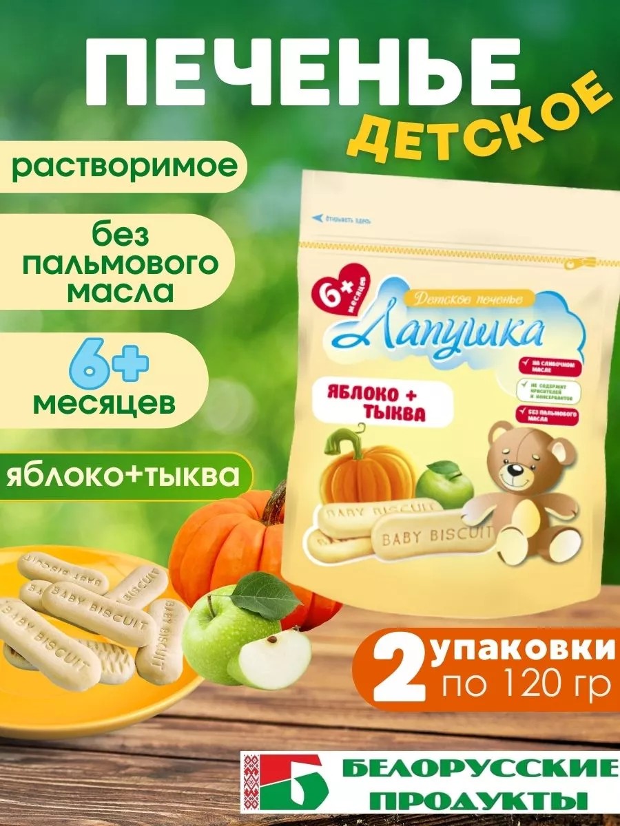 Натуральное детское печенье для детей с раннего возраста. Печенье растворимое яблоко+тыква. Яблочное пюре богато пектином, а также большим кладезем витаминов. Совместно с тыквенным пюре обеспечит синергический эффект и поддержит иммунную систему растущего организма!