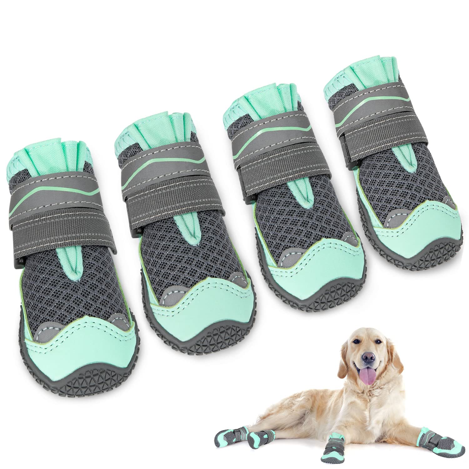 ?Several size options? There are 9 sizes (size 0 - 8) to choose from.Our sizes are based on the inner diameter of the shoe, please make sure that you carefully measure the width of your dog's paws and then refer to the size table in the picture.You can choose the right size for your dog so that it feels comfortable.?Multi scene application? This dog shoe is suitable for indoor and outdoor use.Interios helps dogs to run on hardwood floors and prevents dog paws from scratching floors and sofas.The light dog shoes are also ideal for hikes, travel and trekking tours, so that you don't have to worry that your dog's paws become dirty or injure.?Non -slip and hard -wearing sole? The non -slip design of the sole offers great stability and support for your dog. Shoes Dog paws can effectively protect the dog's safety so that dogs do not slip to violate the rain.The soft rubber sole and the waterproof leather tip protect your dog's paws from sharp thorns, hot plasters and rough salt particles on snowy days.?Double adjustable reinforcement? This paw protection dog shoe has a wide open seam and two adjustable Velcro fasteners, which can be set to the right size for your dog's leg size, which can easily be put on and pulled out.The reflective Velcro fastener improves visibility and helps your dog to run safely at night, which allows pedestrians to notice and protect their dog at night.?Breathable and comfortable? The dog boots paw protection take over three layers of mesh and premium rubber soles.And the design of the dog shoes adapts to the shape of the dog's paw.Our dog shoes paw protection is soft and comfortable, breathable, not stuffy and does not cause rubbing. The dense mesh upper material also keeps dirt and deposits away and ensures that your dog's paws remain dry and comfortable.Very easy to clean.?Mehrere Größenoptionen? Es stehen 9 Größen (Größe 0 - 8) zur Auswahl. Unsere Größen basieren auf dem Innendurchmesser des Schuhs, bitte stellen Sie sicher, dass Sie die Breite der Pfoten Ihres Hundes sorgfältig messen und sich dann auf die Größentabelle im Bild beziehen. Sie können die richtige Größe für Ihren Hund wählen, damit er sich wohl fühlt. ?Multi-Scene Anwendung?Dieser Hundeschuh ist für den Innen- und Außenbereich geeignet. In Innenräumen hilft es Hunden, problemlos auf Hartholzböden zu laufen und verhindert, dass Hundepfoten Böden und Sofas zerkratzen. Die leichten Hundeschuhe eignen sich auch hervorragend für Wanderungen, Reisen und Trekkingtouren, so dass Sie sich keine Sorgen machen müssen, dass die Pfoten Ihres Hundes schmutzig werden oder sich verletzen. ?Rutschfeste und strapazierfähige Sohle?Das rutschfeste Design der Sohle bietet große Stabilität und Halt für Ihren Hund.Schuhe Hundepfoten kann die Sicherheit des Hundes effektiv schützen, so dass Hunde nicht verrutschen, um im Regen zu verletzen. Die weiche Gummisohle und die wasserdichte Lederspitze schützen die Pfoten Ihres Hundes vor scharfen Dornen, heißem Pflaster und groben Salzpartikeln an verschneiten Tagen. ?Doppelte einstellbare Verstärkung?Dieser Pfotenschutz-Hundeschuh hat eine breite offene Naht und zwei verstellbare Klettverschlüsse, die auf die richtige Größe für den Beinumfang Ihres Hundes eingestellt werden können, wodurch er leicht an- und ausgezogen werden kann. Der reflektierende Klettverschluss verbessert die Sichtbarkeit und hilft Ihrem Hund, nachts sicher zu laufen, das Fußgängern erlaubt, Ihren Hund nachts zu bemerken und zu schützen. ?Atmungsaktiv und bequem?Die Hundestiefel Pfotenschutz übernehmen drei Schichten aus Mesh und Premium Gummisohlen. Und das Design des Hundeschuhe passt sich der Form der Pfote des Hundes an. Unsere Hundeschuhe Pfotenschutz ist weich und bequem, atmungsaktiv, nicht stickig und verursacht kein Reiben.Das dichte Mesh-Obermaterial hält außerdem Schmutz und Ablagerungen fern und sorgt dafür, dass die Pfoten Ihres Hundes trocken und komfortabel bleiben. Sehr leicht zu reinigen.SlowTon Hundeschuhe Pfotenschutz, 4 Stück atmungsaktive Hunde Schuhe Outdoor mit Rutschfester Sohle, verstellbarem reflektierendem Klettverschluss Hundestiefel für kleine, mittlere und große Hunde Size 8: Breite 7.5 cm E.Grün-atmungsaktive (4 Stück)