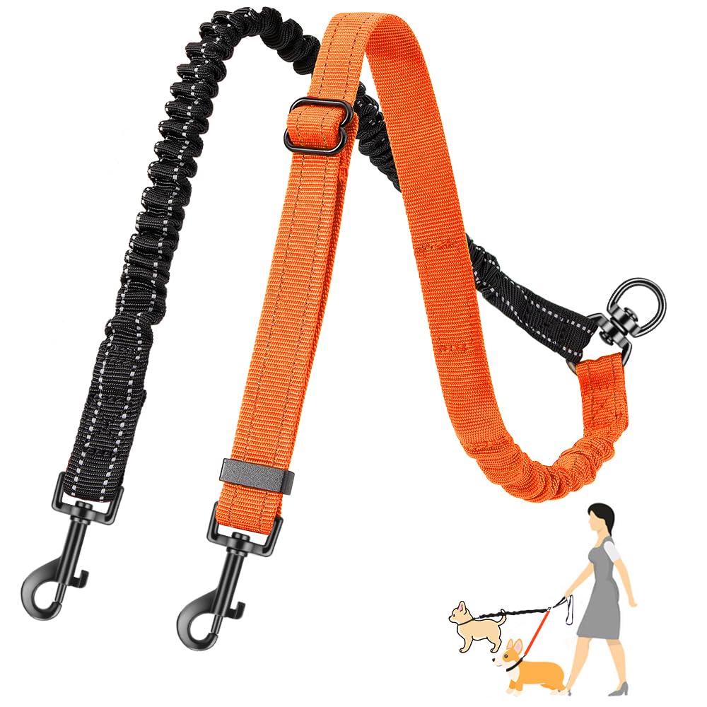 SlowTon Double Dog Leash Coupler No Tangle 360 Swivel Dual Leashes for Walking 2 Dogs Adjustable Length Reflective Splitter Leash for Training Small Dogs (Black&Orange) For Small Dogs B-black&orange