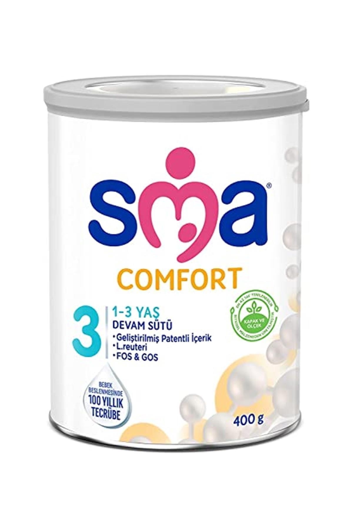 SMA COMFORT 3 400g 1-3 Years Follow-On Milk Improved Patented Ingredient L.Reuteri FOS GOS OPTIPRO , the protein technology developed based on Nestlé's research on breast milk, provides protein content in quantity and quality appropriate to your child's needs. IMPORTANT WARNING: Breast milk is best for babies, and breastfeeding should continue for as long as possible. SMA COMFORT 3 is part of a diversified diet for children aged 1-3 years after they start appropriate complementary feeding. It is not a substitute for breast milk and should not be used as a substitute for breast milk during the first 6 months. The decision to start complementary feeding should only be made by independent healthcare professionals based on your baby's growth and developmental needs. Standard Feeding Table WARNING: Prepare SMA COMFORT 3 immediately before feeding your baby and only one bottle at a time. Use only the measuring cup provided. Feed your baby immediately after preparation and carefully follow the usage recommendations. Always hold your baby while feeding and do not leave him her unattended. AGE: 12-36 Months WARM WATER (BOILED) (ml): 210 ml SCALE: 7 NUMBER OF FEEDINGS IN 24 HOURS: 2-3 The Standard Feeding Table is a general guide based on average needs. If you think your baby needs more or less than the recommended amounts of follow-on milk, consult your healthcare professional. 1 measuring cup contains 4.3 g of powdered follow-on milk. Add one measuring cup of SMA COMFORT 3 to 30 ml of water. To preserve the number of live cultures in the product, make sure that the boiled water has cooled to body temperature before adding the powdered formula. Use only the measuring spoon located under the product's lid. Do not use less or more powdered formula than indicated in the feeding table unless recommended by a doctor. This may cause your baby to become dehydrated or not get enough nutrition. Always consult your doctor before adding new foods to your baby's diet. RECOMMENDATIONS FOR USE Do not reuse leftover formula after feeding your baby. Do not add food to baby milk in a bottle. Do not heat baby milk in the microwave. The heat distribution may be uneven and your baby's mouth may be burned. The special measuring spoon is located on the foil when the box is first opened. For subsequent uses, place the measuring spoon in the special compartment under the lid as shown in the "Preparing the Product" section. Storage Recommendations: Store the product in a cool, dry place. After opening the box, keep the box closed with its plastic lid to maintain the freshness of the product. Use the opened box within 3 weeks. Avoid storing it at high temperatures for extended periods. Improper preparation and storage are harmful to your health. Preparation: Wash your hands thoroughly. Thoroughly clean the feeding bottle, teat, and lid. Soak the bottle in boiling water until use. Boil drinking water for five minutes and allow it to cool. Add the amount of warm water recommended in the feeding chart. Use only the measuring cup provided and scrape off any excess from the measuring cup inside the box. Add the amount of powdered formula recommended in the feeding chart. After use, store the measuring cup suspended in the box as shown in the picture. Close the bottle and shake well until the powder is completely dissolved. Close the opened box tightly after each use. Ingredients Skimmed milk, lactose (dairy product), vegetable oils [high oleic acid sunflower, low erucic acid rapeseed, sunflower, antioxidant (alpha-tocopherol, L-ascorbylpalmitate)], demineralized whey powder (dairy product), galacto-oligasaccharide, calcium salts of citric acid, fish oil, potassium citrate, emulsifier (soy lecithin), fructo-oligasaccharide, magnesium chloride, choline bitartrate, potassium chloride, amino acids (L-phenylalanine, L-histidine), sodium chloride, sodium citrate, sodium salts of orthophosphoric acid, vitamin C (sodium L-ascorbate), taurine, inositol, ferrous sulfate, zinc sulfate, L-carnitine, vitamin E (DL-alpha-tocopheryl acetate), Lactobacillus reuteri culture (DSM 17938 ), niacin (nicotinamide), acidity regulator (citric acid), pantothenic acid (D-pantothenate, calcium), copper sulfate, vitamin B1 (thiamine mononitrate), vitamin B2 (riboflavin), vitamin A (retinyl acetate), vitamin B6 (pyridoxine hydrochloride), manganese sulfate, potassium iodide, folate (folic acid), sodium selenate, vitamin K (phytomenadione), vitamin D (cholecalciferol), biotin (D-biotin), vitamin B12 (cyanocobalamin). Under license from BioGaia AB. Allergen Warning: Contains milk, soy, and fish oil. 1 scoop contains 4.5 g of powdered follow-on milk. 100 ml Follow-on Milk 13.4 g of powdered follow-on formula 90 ml water. Carbohydrate source: 0 lactose.