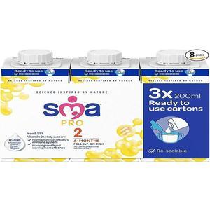 SMA PRO Follow on Milk 6 - 12 Month 3 x 200 Ml, Pack Of 8.. SMA aims to provide customers with many high quality products and to satisfy every customer's needs. INGREDIENTS Water Skimmed Milk Lactose (Milk) Vegetable Oils (Sunflower, Rapeseed) Whey Protein (Milk) Whey Permeate (Milk) Calcium Citrate Potassium Citrate DHA (Fish Oil) Emulsifier (Soya Lecithin) Calcium Chloride Sodium Phosphate L-Phenylalanine Potassium Phosphate 2'-Fucosyllactose (2'FL) Vitamin C L-Isoleucine L-Leucine Magnesium Citrate Sodium Chloride L-Tryptophan L-Histidine L-Threonine Ferrous Sulphate L-Valine Antioxidants (Tocopherol-Rich Extract, Ascorbyl Palmitate) Zinc Sulphate Vitamin E Niacin Pantothenic Acid Copper Sulphate Vitamin A Thiamin Vitamin B6 Manganese Sulphate Potassium Iodide Folic Acid Sodium Selenate Vitamin K Vitamin D Biotin Vitamin B12 SAFETY WARNING IMPORTANT NOTICE: Breast milk is best for babies and breastfeeding should continue for as long as possible. SMA® PRO Follow-on Milk is only suitable for babies over 6 months as part of a mixed diet. It should not be used as a substitute for breast milk during the first 6 months. The decision to start weaning or to use this product before 6 months, should be made only on the advice of a doctor, midwife, health visitor, public health nurse, dietitian or pharmacist, based on baby's individual needs. When bottle-feeding, do not allow prolonged or frequent contact of milk feeds with teeth as this increases the risk of tooth decay. Ask your healthcare professional or dentist for advice. Never leave your baby alone during feeding as there is a risk they might choke. Cap is a small part and poses a choking hazard. Keep cap out of reach of children. MANUFACTURER CONTACT INFORMATION Nestlé UK Ltd, 1 City Place, Gatwick, RH6 0PA See more