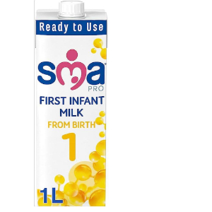 SMA PRO First Infant Milk From Birth, 1 Litre. Nutritionally complete with Omega 3 (DHA). INGREDIENTS Water, Skimmed MILK, Lactose (MILK), Vegetable Oils (Sunflower, Coconut, Rapeseed), Whey Protein (MILK), Calcium Citrate, 2'-Fucosyllactose (2'FL), Emulsifier (SOYA Lecithin), Potassium Citrate, FISH Oil (DHA), Choline Bitartrate, Potassium Chloride, Magnesium Chloride, L-Phenylalanine, Sodium Chloride, Vitamin C, Calcium Phosphate, Taurine, Inositol, L-Histidine, Nucleotides (Cytidine-, Disodium Uridine-, Adenosine-, Disodium Guanosine-5'-Monophosphate), Antioxidants (Tocopherol-Rich Extract, Ascorbyl Palmitate), Ferrous Sulphate, Zinc Sulphate, L-Carnitine, Vitamin E, Niacin, Pantothenic Acid, Copper Sulphate, Vitamin A, Thiamin, Vitamin B6, Manganese Sulphate, Riboflavin, Potassium Iodide, Folic Acid, Sodium Selenate, Vitamin K, Vitamin D, Biotin, Vitamin B12 DIRECTIONS Preparing Your Baby's Feed Failure to follow instructions on preparation and storage may make your baby ill. 1 Wash hands well. Wash and sterilise all utensils according to manufacturer's instructions. 2 If carton is damaged in any way, do not use. Shake carton well and unscrew cap. Pour desired amount into a sterilised bottle and add sterilised teat and cap. Replace plastic cap on carton. 3 SMA® Pro First Infant Milk can be fed at room temperature. If required to heat, stand filled bottle in warm water, do not immerse the teat. 4 Before feeding shake the bottle well. If warmed, test temperature by shaking a few drops onto the inside of your wrist-milk should be lukewarm. SAFETY WARNING Important notice: breast milk is best for babies and breastfeeding should continue for as long as possible. Infant milks are suitable from birth when babies are not breastfed and should only be used on the advise of a doctor, midwife, health visitor, public health nurse, dietitian or pharmacist, or other professionals responsible for maternal and child care. When bottle-feeding, do not allow prolonged or frequent contact of milk feeds with teeth as this increases the risk of tooth decay. Ask your healthcare professional or dentist for advice. Always hold your baby while feeding. Do not leave baby unattended as they might choke. MANUFACTURER CONTACT INFORMATION Produced for: SMA Nutrition, 1 City Place, Gatwick, RH6 0PA. In Republic of Ireland: 3030 Lake Drive, Citywest Business Campus, Dublin 24. See moreHalal certified. Ready to drink, in a 1 Litre resealable carton. Nutritionally complete with Omega 3 (DHA). Breast milk substitute. Stage 1 Suitable From Birth.