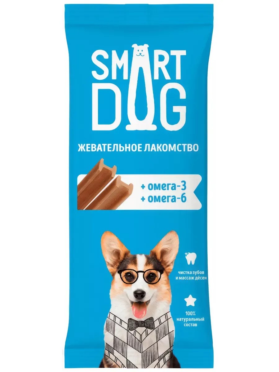 Smart Dog Chewable Treats for Small Breed Dogs and Puppies, S (3 pcs), 36 g Dental Sticks Chewable treats are a healthy and tasty treat for puppies aged 6 months and older and for adult dogs! These treats help prevent plaque and tartar buildup, while their shape effectively massages the gums. Benefits: source of omega-3 and -6 fatty acids; 100% natural; no salt, artificial colors, or preservatives; delicious beef will satisfy even the most discerning gourmet! These treats are suitable for puppies aged 6 months and older and for adult dogs. Choose the treat that's right for your pet: S for small breed dogs (3 treats per pack); M for medium breed dogs (2 treats per pack); L for large breed dogs (1 treat per pack). Feeding recommendations: treats should not make up more than 10% of the daily diet. Provide your pet with constant access to drinking water. Suitable for puppies from 6 months of age. Do not leave your pet unattended with treats. Net weight: 36 g. Ingredients: meat (beef), by-products, corn, products of vegetable origin, salmon oil, food additives. Nutritional value per 100 g: proteins - not less than 5%; fats - no more than 1%; moisture - no more than 15%. Energy value per 100 g: 281 kcal.
