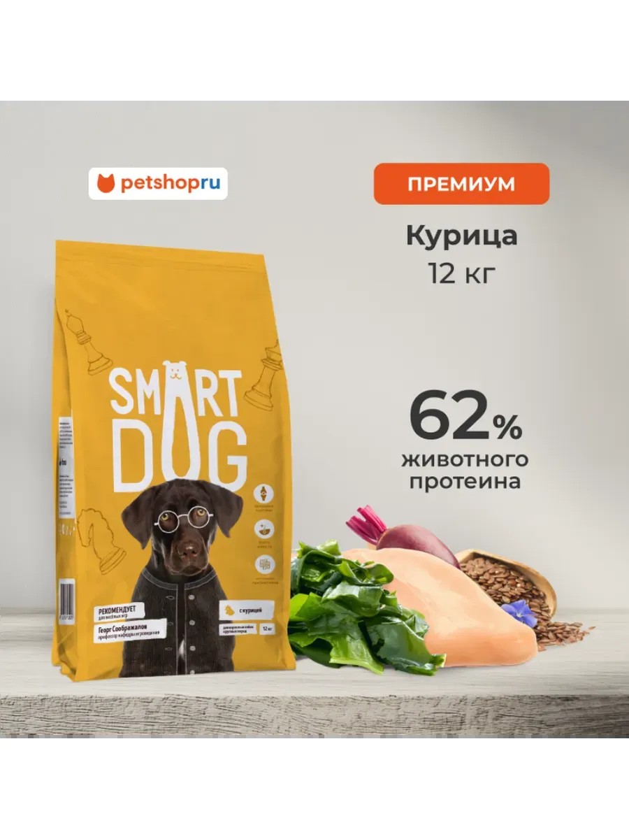 Сухой корм Smart Dog разработан профессионалами для настоящих пушистых гениев!Полнорационный и сбалансированный корм с тщательно подобранным составом и необходимым комплексом питательных веществ поможет сохранить здоровье и активность Вашего питомца для достижения великих целей!Изготовлен без добавления искусственных красителей, консервантов, ароматизаторов и ГМО.Состав: мука из курицы и индейки, цельные злаки (маис), пшеница, растительный протеин, куриный жир, натуральные вкусо-ароматические добавки, сушёная мякоть свёклы, яйцо сушеное цельное, минеральные вещества, рыбий жир, витамины, семя льна, пивные дрожжи, морские водоросли, глюкозамин, антиоксидант.Пищевая ценность: Белки: 22 %Жиры: 10 %Клетчатка: 4 %Зола: 7 %Влага: 10 %Кальций: 1.1 %Фосфор: 0.9 %Витамин А: 6000 МЕ/кгВитамин Д: 600 МЕ/кгВитамин Е: 130 мг/кгЭнергетическая ценность: 327 ккал / 100 граммов.