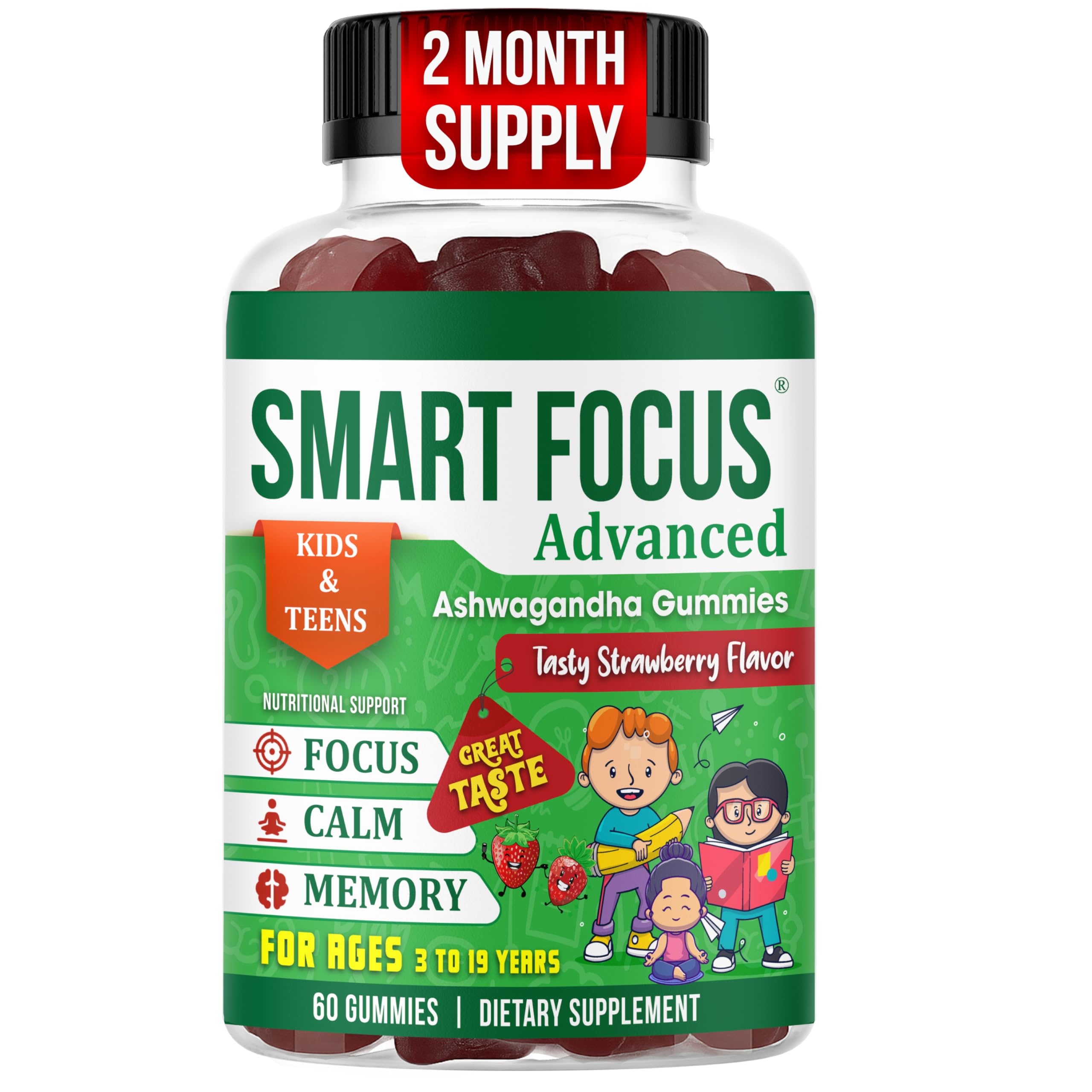 Smart Focus Kids Focus Gummies with Calm Ashwagandha Supplements for Kids & Teens Calm Gummies for Attention Memory & Relaxed Sleep Natural Strawberry Flavor 60 Gummies