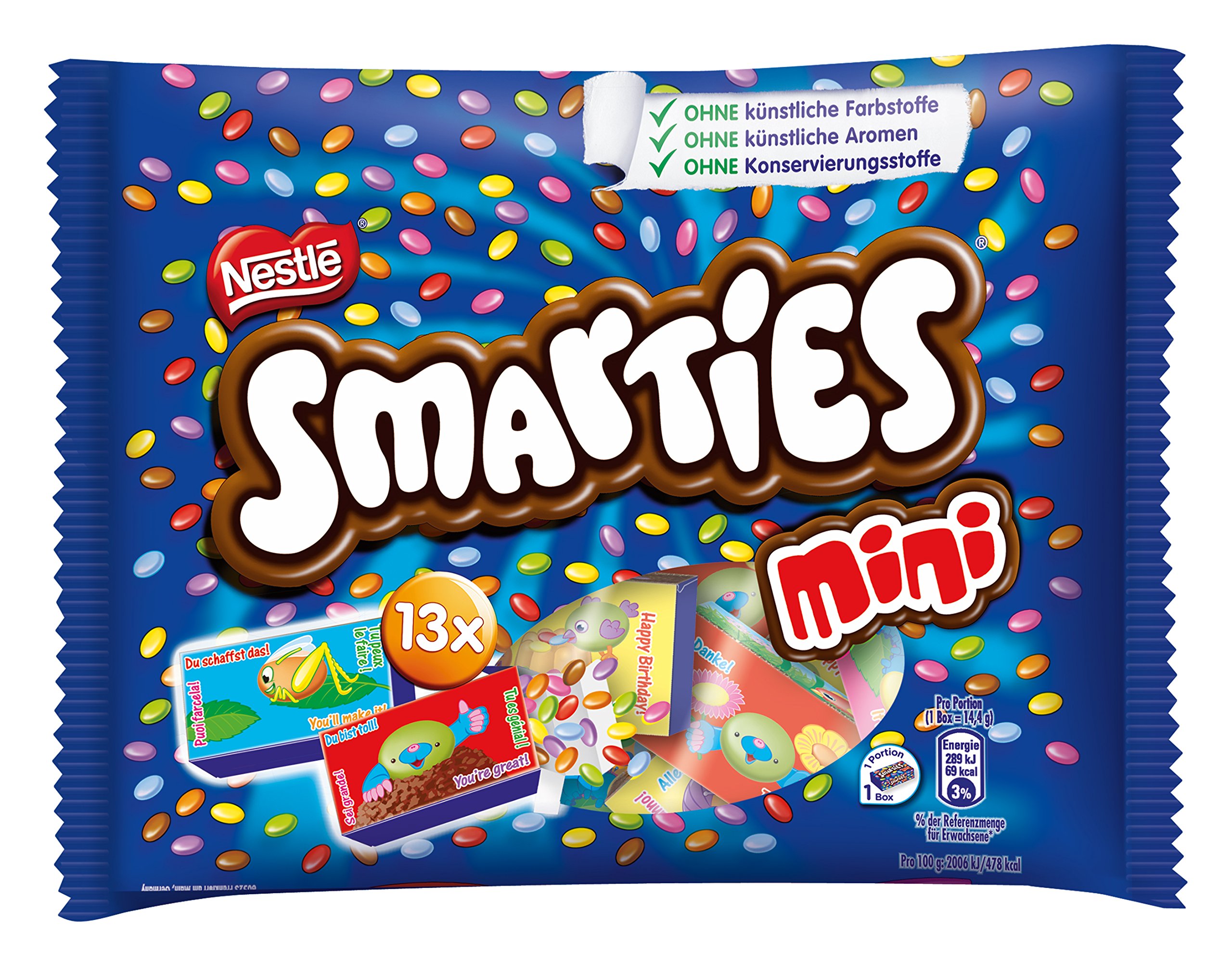 Smarties Mini are delicious classic milk chocolates with a pretty sugar coating and no artificial colors. INGREDIENTS Sugar, cocoa butter, fat-reduced milk powder, cocoa mass, wheat flour, butterfat, starch, emulsifier, lecithin, fruit and plant concentrate (saliva, radish, black carrot, lemon, hibiscus, spirulina concentrate, glazing agent (carbonate), white beeswax), natural vanilla flavoring, invert sugar syrup. SAFETY WARNING Toddlers (under 4 years old) have limited purchg power and may swallow small candies. See more