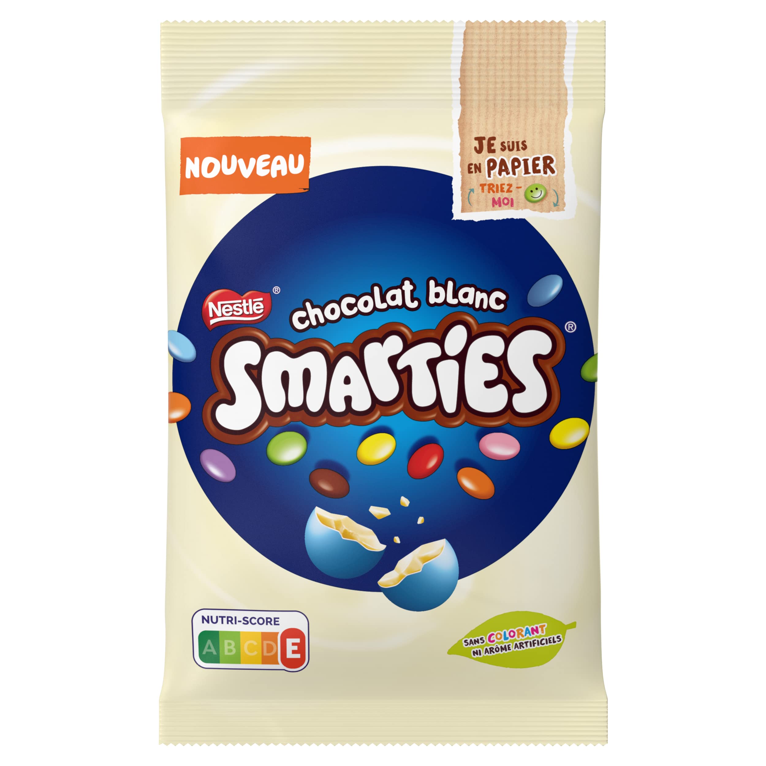 Discover the new SMARTIES: sugared balls revisited in their white chocolate version. Find the sweetness and crunch of SMARTIES in balls that are just as delicious and colorful as ever, with a delicious white chocolate taste. SMARTIES beads are colored with ingredients of natural origin from a blend of fruit and plant concentrates. SMARTIES engages with Rainforest Alliance to support cocoa producers and help educate their children through the Nestlé Cacao Plan. INGREDIENTS Ingredients: Sugar, skimmed MILK powder, cocoa butter, WHEAT flour, anhydrous MILK fat, WHEY powder, starch, emulsifier (sunflower lecithin), colors (beet red, carotenoids, curcumin), spirulina concentrate, glazing agents (carnauba wax, white beeswax), plant concentrates (safflower, radish), extract of BARLEY malt, natural vanilla flavor (with colors of natural origin). SAFETY WARNING Important: young children (under 4 years old) have limited chewing abilities and can choke on small candies. Made from a blend of fruit and plant concentrates, SMARTIES balls are colored with naturally sourced ingredients. These white chocolate candies are sure to delight the whole family. Rediscover the sweetness and crunch of SMARTIES in these balls, as delicious and colorful as ever. Découvrez la nouveauté SMARTIES : les billes dragéifiées revisitées dans leur version chocolat blanc. Retrouvez la douceur et le craquant de SMARTIES dans des billes toujours aussi gourmandes et colorées, au bon gout de chocolat blanc. Les billes SMARTIES sont colorées avec des ingrédients d'origine naturelle provenant d'un mélange de concentré de fruits et de plantes. SMARTIES s'engage avec Rainforest Alliance pour soutenir les producteurs de cacao et aide à l'éducation de leurs enfants à travers le Nestlé Cacao Plan. INGRÉDIENTS Ingrédients: Sucre, LAIT écrémé en poudre, beurre de cacao, farine de BLE, matière grasse de LAIT anhydre, PETIT-LAIT en poudre, amidon, émulsifiant (lécithine de tournesol), colorants (rouge de betterave, caroténoïdes, curcumine), concentré de spiruline, agents d'enrobage (cire de carnauba, cire blanche d'abeille), concentrés de plantes (carthame, radis), extrait de malt d'ORGE, arôme naturel de vanille (aux couleurs d'origine naturelle). AVERTISSEMENT DE SÛRETÉ Important : les jeunes enfants (moins de 4 ans) ont des capacités de mastication limitées et peuvent s'étouffer avec des confiseries de petite taille. Provenant d'un mélange de concentré de fruits et de plantes. Les billes SMARTIES sont colorées avec des ingrédients d'origine naturelle. Des bonbons au chocolat blanc pour faire plaisir à toute la famille. Retrouvez la douceur et le craquant de SMARTIES dans des billes toujours aussi gourmandes et colorées.