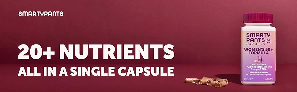 SmartyPants Capsules Women’s 50+ Multi contains over 20 premium nutrients and minerals to support your brain, heart, bone, eye, energy and immune health – all in one easy-to-take vegetarian capsule. Women’s 50+ Multi contains omega-3 DHA from algal oil for brain health,