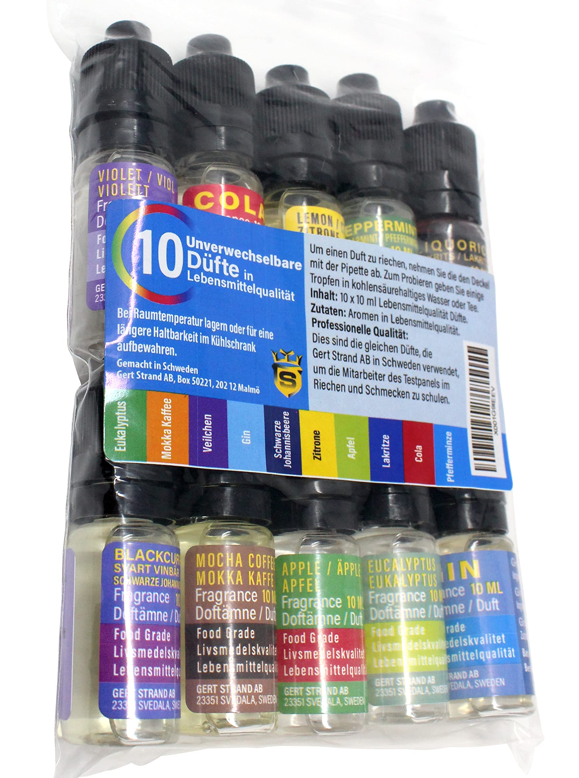 Personal trainer for the nose Our sense of smell has the unique ability to improve and regenerate through daily training.Smell can be trained like a muscle. Winemakers, perfumers and chefs benefit from it by sharpening their smell by daily sniffing. Baristi, flavorists, confectioners and bakers can also benefit from training. In addition, a well-trained smell and taste increases your general quality of life because you can fully perceive and enjoy food, wine, sweet, fruits and more in terms of taste. With the odor training, you ideally carry out trial exercises twice a day with different flavors. The scent of our compositions is pleasant, but still intense. It is important that you carry out the smell training constantly and do not interrupt. This smell training kit is based on the research of Professor Thomas Hummel from the University of Dresden.The kit is also used in our company to train the product testers. The smell training with our very high quality scents only takes a few minutes a day.training fragrance: We have put together this set with the help of experts based on the research of Prof. Hummel from 2009 and 2015.Our scents are very high quality and offer pleasant and effective odor training.Simple application: You should smell the scents twice a day in changing order, sniff, ideally in the morning and in the evening.The scents can also be mixed in any way.Change the mixture once a week.Odor training: With the smell training set you ideally carry out trial exercises twice a day with different flavors.The scent of our compositions is pleasant, but still intense.We recommend carrying out the smell training constantly and not to interrupt.A fine nose: a good sense of smell increases satisfaction and attitude to life.Smells surround us everywhere.There is no moment in life without fragrance molecules.While sniffing something, the fragrance molecules get through the nose into the brain and are classified individually so that they can distinguish every fragrance.With our smell training set you train your smell and taste. PERSONAL TRAINER FÜR DIE NASE Unser Geruchssinn hat die einzigartige Fähigkeit, sich durch tägliches Training zu verbessern und zu regenerieren. Das Riechen lässt sich trainieren wie ein Muskel. Winzer, Parfümeure und Köche profitieren davon, indem sie ihren Riechsinn durch tägliches Schnuppern schärfen. Auch Baristi, Flavoristen, Konditeure und Bäcker können aus dem Training ihren Nutzen ziehen. Zudem steigert ein gut trainierter Geruchs- und Geschmackssinn Ihre allgemeine Lebensqualität, da Sie Speisen, Wein, Süßes, Früchte und mehr geschmacklich voll wahrnehmen und genießen können. Mit dem Geruchstraining führen Sie Schnupperübungen idealerweise zweimal am Tag mit verschiedenen Aromen durch. Der Duft unserer Kompositionen ist angenehm, aber dennoch intensiv. Es ist wichtig, dass Sie das Riechtraining konstant durchführen und nicht unterbrechen. Dieses Riechtraining-Kit basiert auf der Forschung von Professor Thomas Hummel von der Universität Dresden. Das Kit wird auch in unserem Unternehmen zur Schulung der Produkttester eingesetzt. Das Riechtraining mit unseren qualitativ sehr hochwertigen Düften dauert pro Tag nur ein paar Minuten.TRAININGSDUFT: Wir haben dieses Set mit Hilfe von Experten basierend auf den Forschungen von Prof. Hummel aus den Jahren 2009 und 2015 zusammengestellt. Unsere Düfte sind qualitativ sehr hochwertig und bieten ein angenehmes und effektives Geruchstraining. EINFACHE ANWENDUNG: Sie sollten die Düfte in wechselnder Reihenfolge zweimal pro Tag riechen, leicht schnuppern, idealerweise Morgens und am Abend. Die Düfte können auch in beliebiger Weise gemischt werden. Wechseln Sie die Mischung einmal pro Woche. GERUCHSTRAINING: Mit dem Riechtrainingsset führen Sie Schnupperübungen idealerweise zweimal am Tag mit verschiedenen Aromen durch. Der Duft unserer Kompositionen ist angenehm, aber dennoch intensiv. Wir empfehlen, das Riechtraining konstant durchführen und nicht zu unterbrechen. EINE FEINE NASE: Ein guter Geruchssinn steigert die Zufriedenheit und das Lebensgefühl. Gerüche umgeben uns überall. Es gibt keinen Moment im Leben ohne Duftmoleküle. Während Sie an etwas schnuppern, gelangen die Duftmoleküle durch die Nase in das Gehirn und werden individuell klassifiziert, so dass Sie jeden Duft unterscheiden können. Mit unserem Riechtrainingsset trainieren Sie Ihren Riech- und Geschmackssinn.Riechtrainingsset mit 10 Düften, je 10 ml | Geruchstraining | Aromatherapie | Trainingsduft