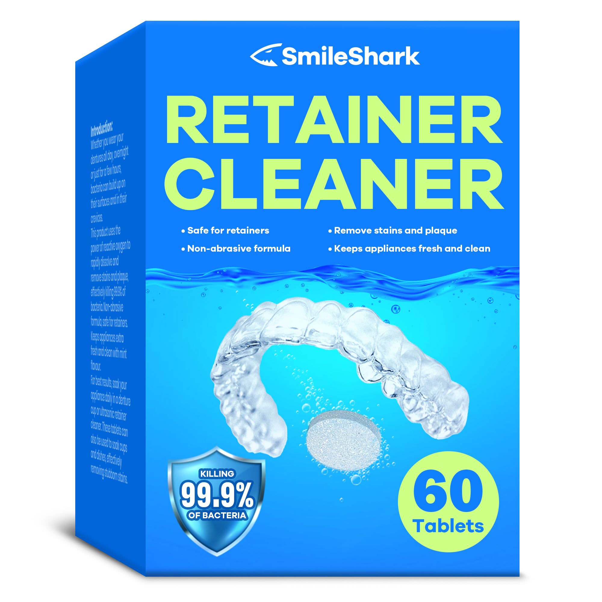 SmileShark Retainer Cleaner (60 Tablets) Denture Cleaning Tablets Powerful Cleaning Agents Odor Neutralizing Odor-Free With a Pleasant Minty Scent Versatile For All Dental Appliances