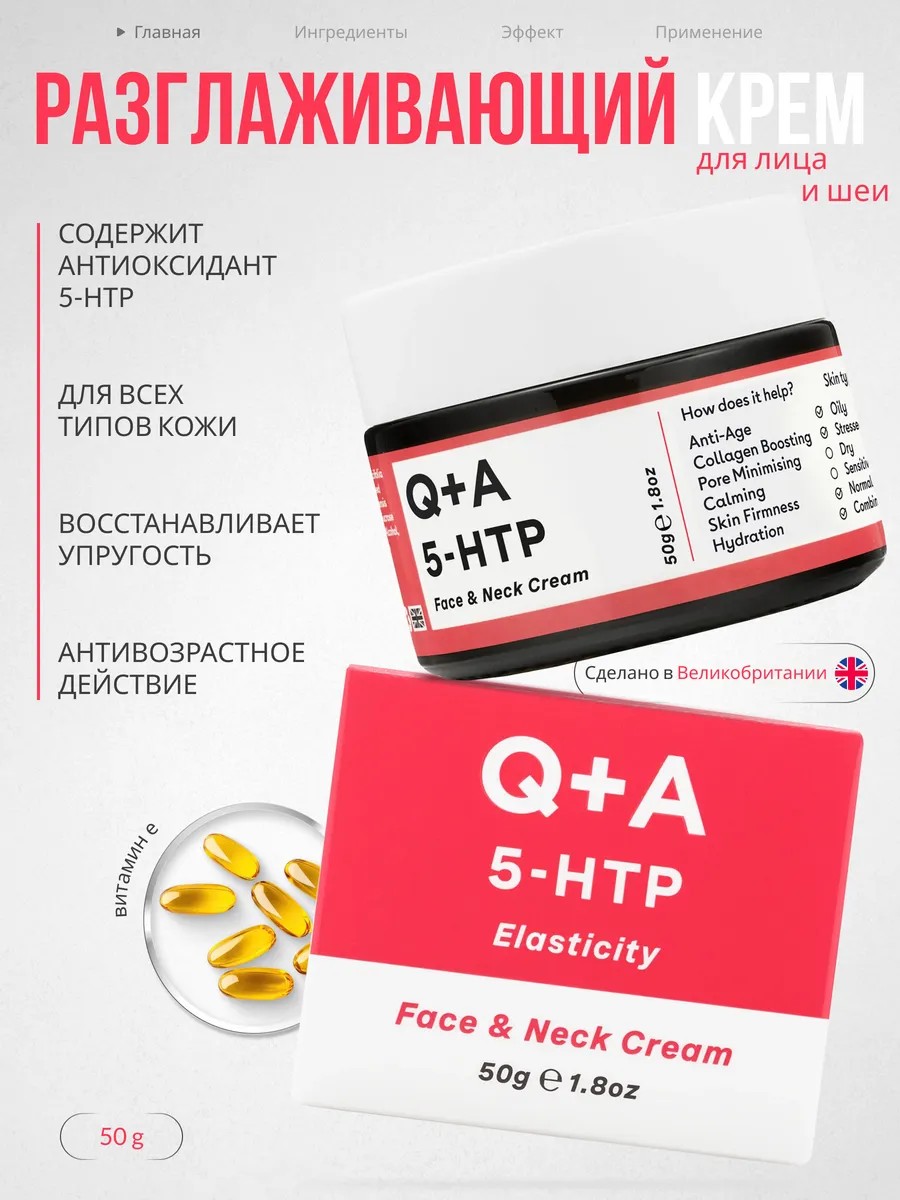 Разглаживающий крем для лица и шеи Q+A 50 гр произведен в Великобритании и идеально подходит для питания кожи. Имеет легкую текстуру, что обеспечивает комфортное нанесение под макияж. Эффективно борется с сухостью, восстанавливая водный баланс кожи и придавая ей свежий вид. Питательный крем для лица Кью плюс Эй на 99% имеет натуральный состав. Способствует улучшению микроциркуляции и выравниванию тона кожи, обеспечивает здоровый цвет лица. Содержит антиоксидант 5-HTP. Оказывает антиоксидантное действие, успокаивает кожу и снимает покраснения. Средство подходит для всех типов кожи: обезвоженной и сухой, возрастной и комбинированной, а также проблемной и чувствительной. Крем для лица можно наносить в любое время: как дневной, так и ночной, он также подходит для ежедневного применения. Текстура крема быстро впитывается без следов жирности или липкости, создавая идеальную базу под макияж. Ежедневное использование улучшает общее состояние кожи: она становится более гладкой, упругой и бархатистой на ощупь. Крем решит множество проблем одновременно: устранит шелушения и сделает тон ровнее, сократит поры и уменьшит воспалительные процессы. Крем стимулирует производство коллагена. Семена гриффонии и содержащиеся в них аминокислоты в сочетании с кофеином и биосахаридной смолой обеспечивают лифтинг и делают кожу эластичнее. Полноценный антивозрастной продукт для всех типов кожи. Натуральные компоненты также способствуют регенерации клеток и укрепляют защитный барьер эпидермиса. Способ применения: нанести необходимое количество средства на очищенную и тонизированную кожу лица на последнем этапе ухода, мягко распределить до полного впитывания. Отлично подойдет на подарок жене, маме и ребенку, а также подруге, девушке и девочке, а также мужчине. Уходовая косметика — это полезный подарок на день рождения и 8 марта, новый год и просто так.
