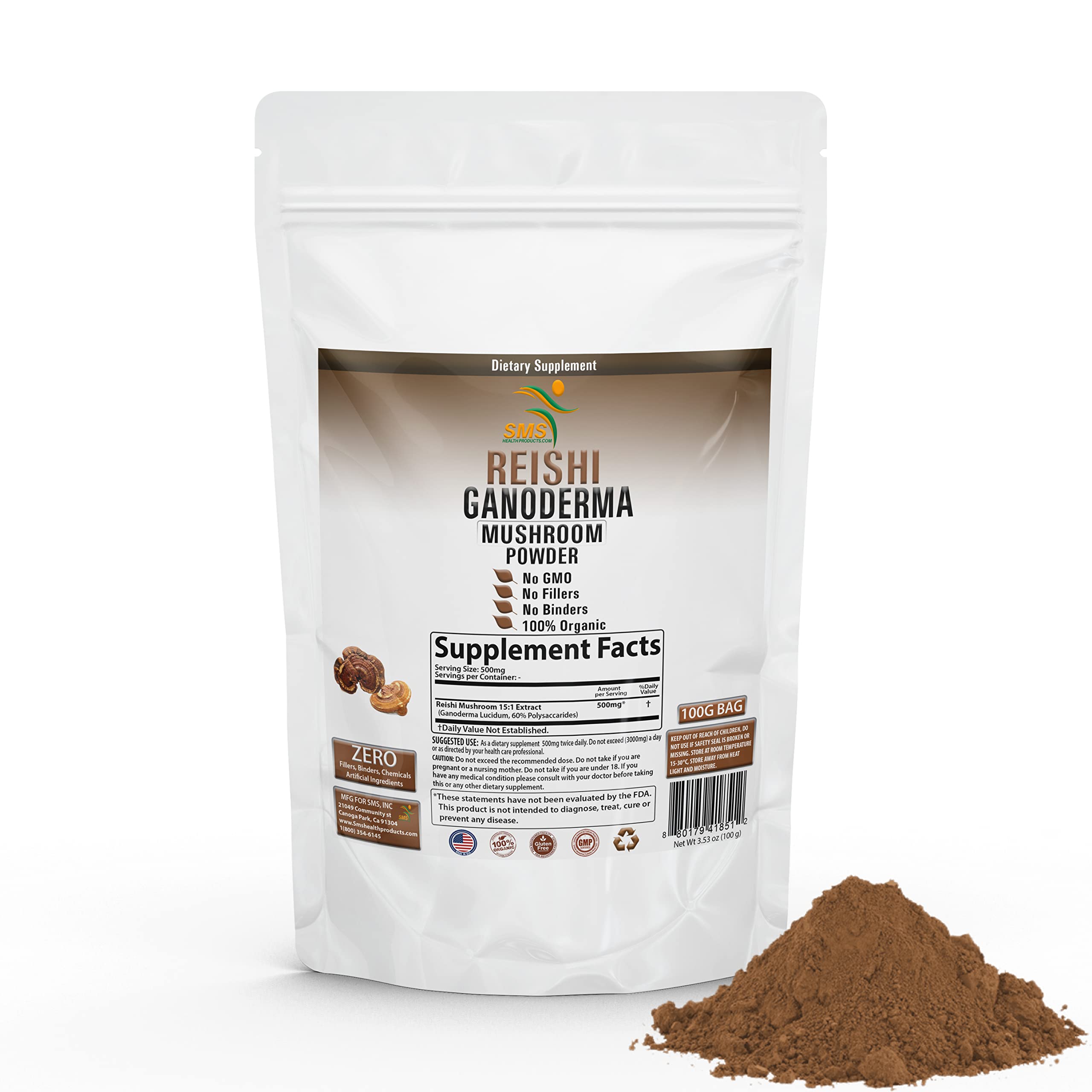 SMSHEALTHPRODUCTS.com Reishi Mushroom 100g Powder 3.52 oz (60% Polysaccharides) for Longevity by SMS Vegan Organic Non-GMO Reishi Extract Supplement for Immune System Support Safe for Pets
