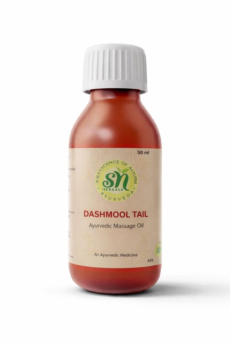 SN Herbals Dashmool Oil is a traditional Ayurvedic massage oil crafted using a time-honored Dashmool herbal blend. It combines ten classical roots with Nirgundi leaf juice and murchit mustard oil, making it suitable for external massage and wellness care. This herbal oil is traditionally used to support comfort from head tension, sinus heaviness, ear-area discomfort, and muscular stiffness. Regular gentle massage helps promote relaxation and a soothing sensation after a long or stressful day. Dashmool Oil is ideal for use on the temples, forehead, neck, ears, or affected areas, making it a versatile addition to daily self-care and massage routines. Its lightweight texture absorbs well without leaving a heavy residue. How to Use: Gently massage a small amount onto the affected area. Use two to three times daily or as part of your regular massage routine. Key Highlights: Traditional Ayurvedic formulation Herbal massage oil for external use Suitable for head, sinus, ear muscle comfort No artificial fragrance or harsh additives Net Quantity: 50 ml For External Use OnlyEasy to Use Travel Friendly Packaged in a convenient 50 ml plastic bottle, suitable for home use or travel. Free from artificial fragrances and harsh chemicals. Multipurpose Herbal Massage Oil Commonly used for muscular discomfort, ear-area massage, and general body relaxation as part of daily wellness routines. Ideal for Massage Local Application Lightweight herbal oil designed for gentle massage on temples, forehead, neck, ears, or affected areas for soothing relaxation. Supports Head Sinus Comfort Traditionally massaged to support relief from head heaviness, sinus discomfort, and everyday tension caused by stress or fatigue. Traditional Dashmool Herbal Formula Formulated with Dashmool botanicals including Shalparni, Prishnaparni, Bilva, Gokshura, Nirgundi leaf juice, and mustard oil, traditionally used in Ayurveda for external application.