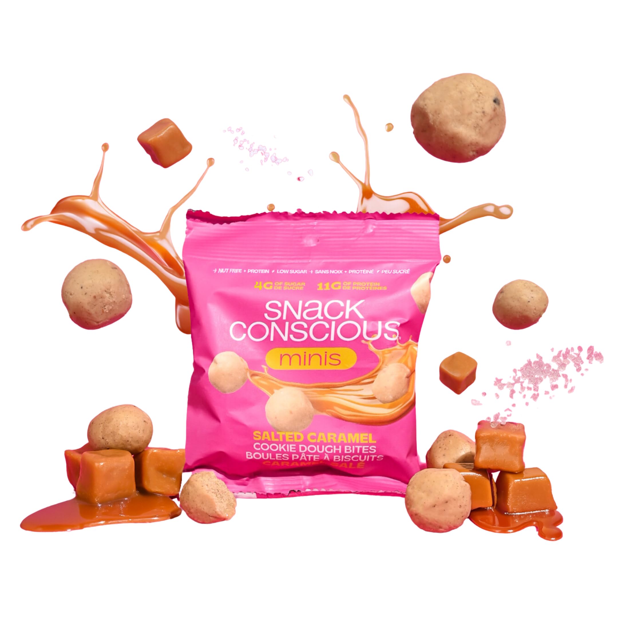 SNACK CONSCIOUS Nut Free Mini Cookie Dough Bites 12 x 50g High Protein Low Sugar Salted Caramel School Safe Plant Based Gluten Free Vegan Non-GMO Made in Canada (12 x 50g Salted Caramel) Salted Caramel 12 x 50g
