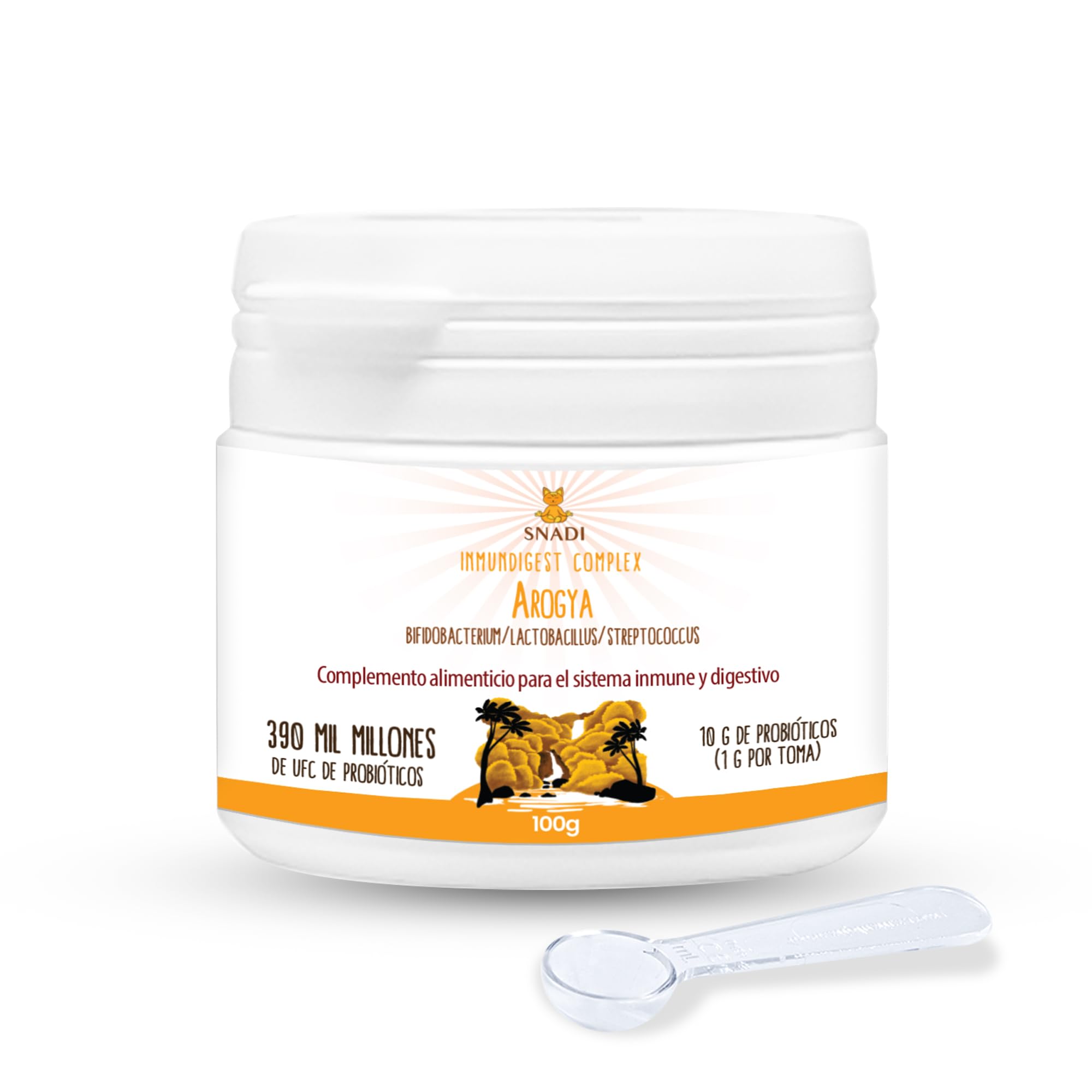 fiber, this supplement is a potent source of Bifidobacterium, Lactobacillus, and Streptococcus. Each package is carefully formulated to provide balance and well-being for your body. For children and adults. INGREDIENTS Agave inulin, Bifidobacterium bifidum, Bifidobacterium longum, Lactobacillus acidophilus, Lactobacillus casei, Lactobacillus rhamnosus, Streptococcus thermophilus, and maltodextrin.Snadi - Probiotiques et Prébiotiques Solubles Avancés 100 gr 390 Milliards UFC COMPLEXE AROGYA INMUNDIGEST Fibre Prébiotique 90g Santé Digestive et Immunitaire Convient à Tous les ÂgesDESCRIPTION DU PRODUIT DESCRIPTION DU PRODUIT Découvrez la puissance d'AROGYA INMUNDIGEST COMPLEX de SNADI, votre allié pour un système digestif et immunitaire sain. Ce complément avancé contient un mélange synergique de probiotiques et de prébiotiques, conçu pour offrir un soutien intégral à votre santé. Avec 390 milliards de CFU de probiotiques et 90 grammes de fibre prébiotique, ce supplément est une source puissante de Bifidobacterium, Lactobacillus et Streptococcus. Chaque emballage est soigneusement formulé pour fournir équilibre et bien-être à votre corps. Pour enfants et adultes. INGRÉDIENTS Agave inulin, Bifidobacterium bifidum, Bifidobacterium longum, Lactobacillus acidophilus, Lactobacillus casei, Lactobacillus rhamnosus, and Streptococcus thermophilus, and maltodextrin.Adapté à toutes les étapes de la vie Ce supplément est sûr et efficace pour la consommation par les adultes et les enfants de plus de 3 ans, assurant fraîcheur et efficacité. Un allié quotidien pour le bien-être intestinal et la force immunitaire à chaque étape de la vie. Approvisionnement pratique jusqu'à 100 jours Avec le COMPLEXE AROGYA INMUNDIGEST, vous bénéficiez d'un régime de dosage efficace conçu pour maximiser les avantages pour la santé à long terme. Un emballage offre jusqu'à 100 jours de soutien digestif et immunitaire continu. Synergie et équilibre pour votre microbiome Formulé avec six souches de bactéries lactiques, incluant Bifidobacterium, Lactobacillus et Streptococcus, pour promouvoir un équilibre sain du microbiome intestinal, soutenant des digestions plus efficaces et renforçant l'immunité. Personnalisez votre dose pour une santé sur mesure Grâce à sa cuillère doseuse, ce complément permet d'ajuster la quantité nécessaire pour répondre aux besoins spécifiques des adultes et des enfants à partir de 3 ans, facilitant une consommation adéquate et confortable. Prenez-le dissous dans un liquide, idéal pour les plus petits. Renforcez votre système digestif et immunitaire Le COMPLEXE AROGYA INMUNDIGEST combine des probiotiques et prébiotiques avancés, incluant 390 milliards d'UFC et 90g de fibre prébiotique, pour un bien-être optimal. Idéal pour améliorer la santé intestinale et la réponse immunitaire de toute la famille.