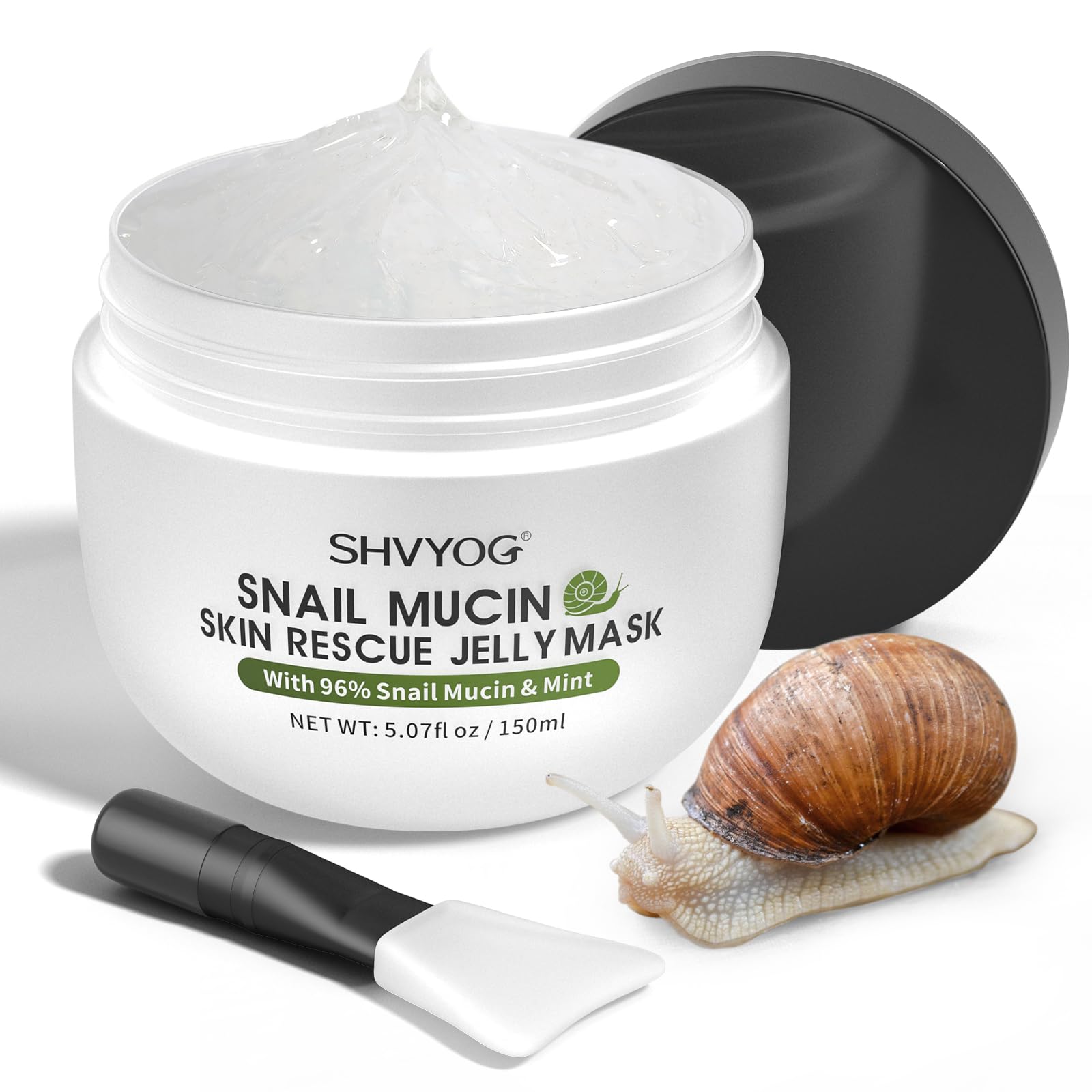 ?IDEAL FOR ALL SKIN TYPES?Our jelly mask is clean, minimalist skincare with simple and pure ingredients. It does not contain any synthetic chemicals or fragrances that can cause irritation. And added natural plant ingredients, suitable for vegetarians. Especially suitable for people with sensitive skin, ideal for all skin types. ?CRUELTY-FREE SNAIL MUCIN?Our snail jelly mask is obtained through a sustainable and ecological approach. No snails are harmed during the entire process, and optimal mucin production occurs when snails are well rested and comfortable in their habitat. So you can use our premium snail mucin mask without any worries. ?HIGH CONCENTRATION OF SNAIL MUCIN?Our snail hydrating face mask contains 96% snail mucin concentrate to stimulate collagen formation, taking your skincare to the next level. Specifically targets your dark spots and dullness. Awaken your skin and restore its original radiance, leaving your skin with a beautiful, youthful glow. ?GENTLY REPAIR DAMAGED SKIN?This snail mask is infused with peppermint and tea tree extracts to calm and give skin a refreshing feel, no need to worry about irritation. If you're experiencing blemishes, it may come in handy. Not only that, but the healing properties of snail mucin can also help your skin recover. Gently soothes damaged skin, helps with skin regeneration and protects against damaging free radicals. ?SNAIL RESCUE FOR SKIN HYDRATION?The snail mucin has powerful hydrating characteristics that strengthen the skin barrier and keep moisture in. Its high concentrations of hyaluronic acid increases skin hydration by 134 percent immediately after application and delivers moisture deep into the skin. Come to a profound snail mucin serum to provide you with abundant moisture throughout the day and improve the current condition of your skin.