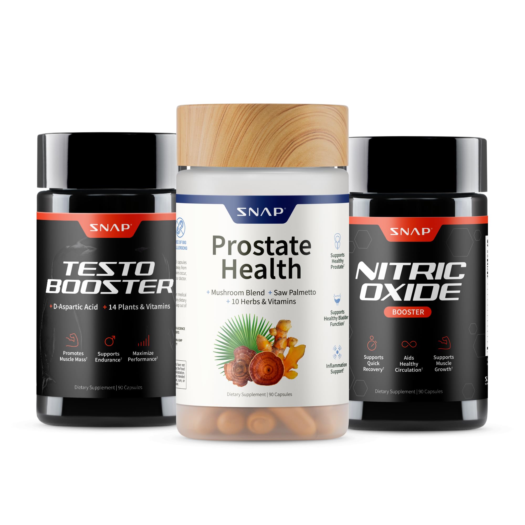 Quality You Can Trust: Crafted by health experts and manufactured in the USA with globally sourced ingredients. These supplements are non-GMO, gluten-free, and made in a GMP-certified facility to ensure purity, potency, and quality. Nitric Oxide Booster: Nitric Oxide plays a role in circulation and energy production, supporting healthy circulation and daily vitality. Our formula supports natural nitric oxide levels and features ginseng root, traditionally used to promote stamina, endurance, and sustained energy—without stimulants or added sugars. . Prostate Health with Saw Palmetto for Men: Our prostate health supplement for men is formulated with saw palmetto, nettle root, and beta-sitosterol to help maintain healthy prostate function, promote urinary comfort, and support bladder tone for fewer nighttime bathroom trips. . Testo Booster for Men: Snap Testo Booster for Men is formulated with a D-aspartic acid complex, Tribulus, and Tongkat Ali—botanicals traditionally used in men's health supplements—to support overall wellness, natural energy, and daily well-being. A strong fit for men seeking a natural daily vitality routine. . Men's Wellness Bundle: Combines daily energy, circulation, and prostate health support to promote overall men's wellness and everyday vitality. .