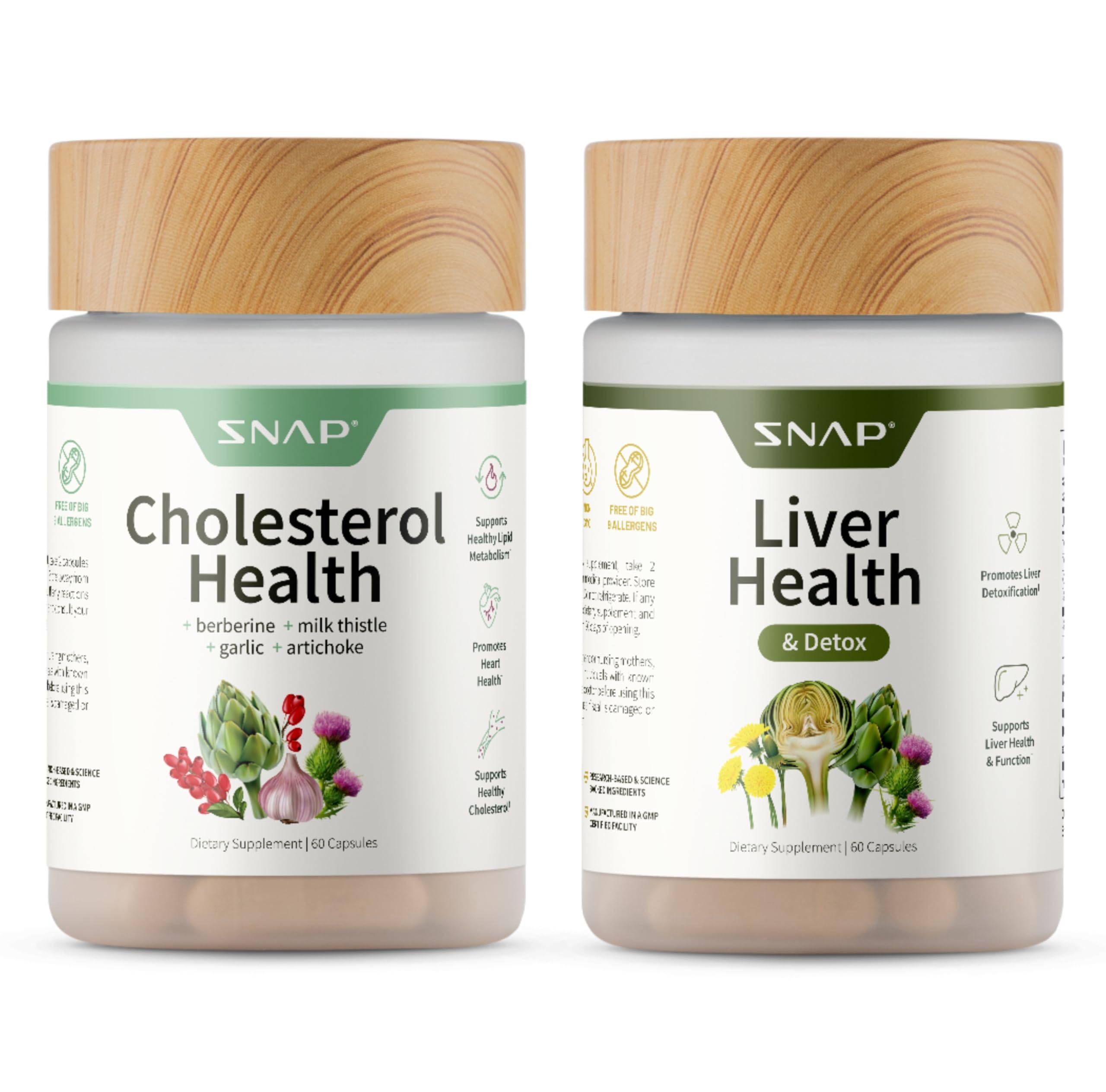 Cholesterol Liver Health Support Bundle — Dual-Action Wellness for Metabolic Support - Support your body's natural metabolic processes with the Snap Supplements Cholesterol Liver Health Support Bundle, a two-part system designed to support heart, liver, and circulatory wellness. This bundle combines two advanced, plant-based formulas that work together to help support healthy cholesterol metabolism, support liver function, and promote daily vitality. The Cholesterol Health supplement features two bioactive blends, including a phytosterol-dense complex with standardized plant sterols, silymarin, and berberine to help support healthy cholesterol and lipid metabolism. Phytosterols and bioactive compounds in this formula help support cardiovascular function, liver health, and metabolic balance while providing antioxidant support for cellular protection. The Liver Health Detox supplement includes clinically studied ingredients such as Milk Thistle, Resveratrol, and Dandelion Extract to help support healthy liver enzyme activity and fat metabolism. This antioxidant-rich blend encourages a healthy inflammatory response, supports digestive function, and promotes overall liver wellness. Together, these synergistic formulas provide nutritional support for cardiometabolic and liver health, helping to maintain healthy cholesterol levels already within the normal range while supporting the body's natural defenses. These statements have not been evaluated by the Food and Drug Administration. This product is not intended to diagnose, treat, cure, or prevent any disease.Quality You Can Trust – Crafted by health experts and manufactured in the USA with globally sourced ingredients. These supplements are non-GMO, vegan-friendly, gluten-free, and produced in a GMP-certified facility to ensure purity, potency, and quality. Antioxidant Metabolic Support: Both formulas provide antioxidant compounds that help protect cells from oxidative stress and support healthy inflammatory pathways. Together, they help support liver function and overall metabolic health. Liver Health Detox Support: The Liver Health supplement combines Milk Thistle, Resveratrol, and Dandelion Extract to help support healthy liver enzyme activity, fat metabolism, and the body's natural pathways. Ideal for individuals seeking plant-based liver wellness support. Cholesterol Health Formula with Plant Sterols Berberine: Features two bioactive blends with standardized plant sterols, silymarin, and berberine to help support healthy cholesterol metabolism and cardiovascular function. Formulated to support circulatory and metabolic balance as part of a daily wellness routine. Dual-Action Cholesterol Liver Wellness: This complete bundle includes two complementary formulas — Cholesterol Health and Liver Health Detox — designed to support heart, liver, and metabolic wellness for men and women.