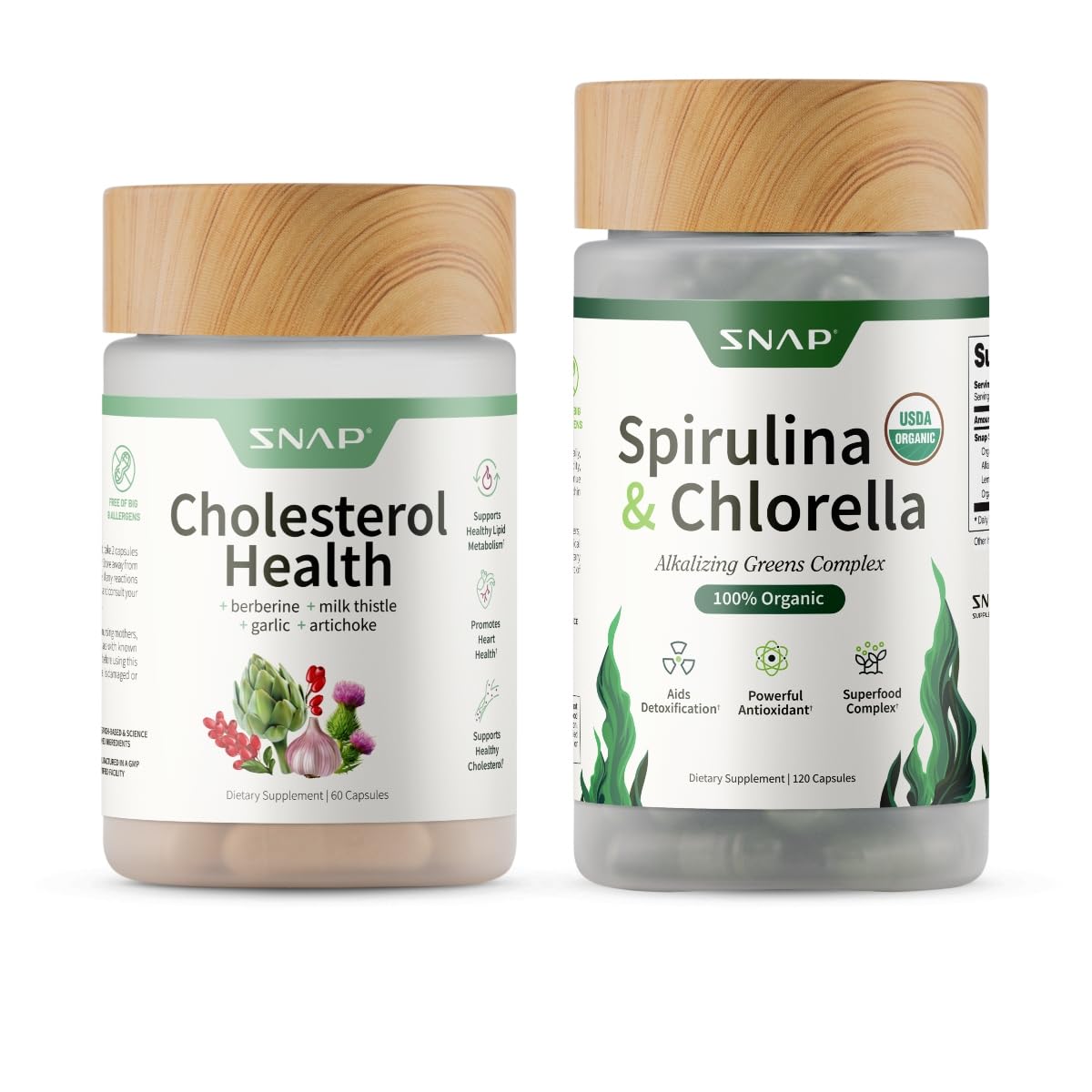 This bundle combines Cholesterol Health and Organic Spirulina Chlorella Capsules to help support metabolic and cellular wellness. Formulated with bioactive ingredients like berberine, silymarin, and plant sterols, Cholesterol Health supports healthy cholesterol levels already within the normal range. The Spirulina Chlorella formula adds a nutrient-rich green complex featuring cracked cell wall chlorella for improved nutrient absorption and spirulina's natural essential fatty acids that help support healthy immune function. Together, they provide plant-powered antioxidant support, help promote healthy lipid metabolism, and support natural energy levels—all in vegan, non-GMO capsules designed to support your body's natural detox and renewal processes. These statements have not been evaluated by the Food and Drug Administration. This product is not intended to diagnose, treat, cure, or prevent any disease.Quality You Can Trust: Crafted by health experts and made in the USA with globally sourced ingredients. Non-GMO, vegan, gluten-free, and produced in a GMP-certified facility to ensure purity and potency. Nutrient-Dense Formula: Spirulina provides proteins, phytonutrients, and trace minerals, while Chlorella delivers vitamins, minerals, and all nine essential amino acids. Together, help support natural energy levels and vitality as part of a balanced lifestyle. Organic Spirulina Chlorella Supplement: This Green Superfood Blend combines Spirulina, Chlorella, Alfalfa, and Wheatgrass to help support balanced nutrition and overall well-being. Milk Thistle Supplement with Garlic Extract: Our Cholesterol Health formula includes milk thistle with silymarin to support healthy liver function, plus garlic extract, a natural prebiotic that helps support digestive and metabolic health. . Healthy Cholesterol Support: This antioxidant-rich supplement combines plant-based nutrients to support healthy cholesterol levels already within the normal range. .