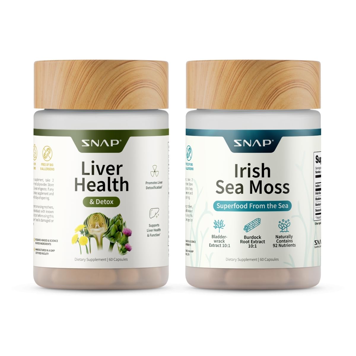 Support your body's natural balance with the Liver Health Irish Sea Moss Bundle, a premium vegan, gluten-free, and non-GMO duo crafted for daily vitality. Liver Health features standardized Milk Thistle, Resveratrol, and Dandelion Extract—botanicals included to help maintain healthy liver function and provide antioxidant support for everyday wellness. Each serving of Irish Sea Moss Capsules combines Irish Sea Moss, Bladderwrack, and Burdock Root, natural sources of iodine and essential minerals that help support immune health, skin vitality, and overall well-being. Both formulas are manufactured in GMP-certified facilities in the USA using globally sourced ingredients and are free from the top 9 allergens, offering gentle, reliable support for both men and women. Designed to fit effortlessly into your daily routine, these research-informed supplements work together to help you feel balanced, energized, and resilient—naturally. These statements have not been evaluated by the Food and Drug Administration. This product is not intended to diagnose, treat, cure, or prevent any disease.Quality You Can Trust: Snap Supplements products are formulated by health experts and manufactured in the USA with globally sourced ingredients. Non-GMO, vegan, gluten-free, and produced in a GMP-certified facility to ensure purity, potency, and consistent quality. Natural Prebiotic: Contains prebiotic nutrients that help support the body's natural digestive and immune function. Plant-Based Nutrients: Rich in natural trace minerals from Irish Sea Moss and Bladderwrack to promote overall wellness. Antioxidant Support: Provides daily antioxidant protection to help support cellular and metabolic health. Liver Health Support: With Milk Thistle, Resveratrol Dandelion to help support healthy liver function.