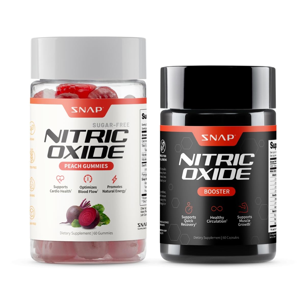 Snap Supplements Nitric Oxide Beet Root Gummies + Nitric Oxide Booster Bundle 60 Sugar-Free Peach Gummies + 60 Vegetarian Capsules