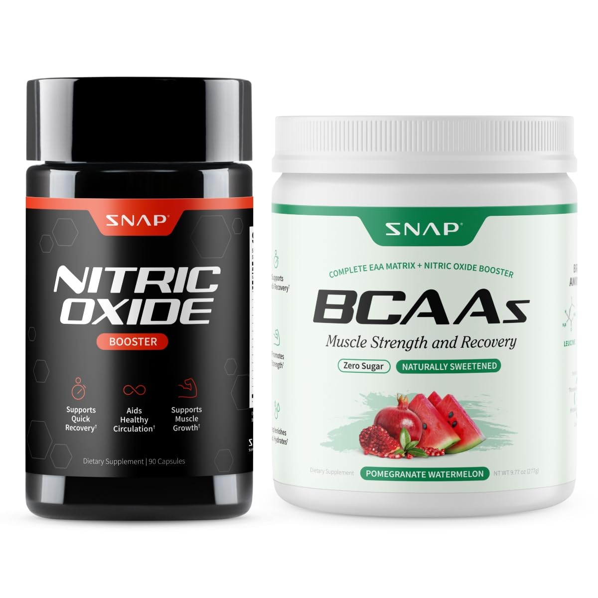 Snap Supplements Nitric Oxide Booster BCAA Bundle — Circulation, Energy Recovery Support - Support healthy circulation, energy, and muscle recovery with the Snap Supplements Nitric Oxide Booster and BCAA Bundle, designed to help maintain performance, endurance, and daily vitality. This dual-formula system pairs our Nitric Oxide Booster Capsules with our BCAA Pomegranate Watermelon Drink Mix for a complete approach to pre- and post-workout wellness. The Nitric Oxide Booster (90 Capsules) features three functional forms of L-Arginine along with adaptogenic herbs to help support nitric oxide synthesis, healthy blood flow, and oxygen delivery. This amino acid blend supports stamina, recovery, and circulation for active men and women seeking natural, stimulant-free energy support. The BCAA Pomegranate Watermelon Drink Mix delivers a refreshing combination of Branched-Chain Amino Acids (Leucine, Isoleucine, and Valine) to help support muscle recovery, hydration, and endurance during workouts. Infused with natural flavor and a balanced amino acid profile, it complements your fitness routine while helping maintain energy metabolism and lean muscle health. Together, these two products provide synergistic support for endurance and post-exercise recovery — ideal for athletes, fitness enthusiasts, and anyone pursuing an active lifestyle. These statements have not been evaluated by the Food and Drug Administration. This product is not intended to diagnose, treat, cure, or prevent any disease.Quality You Can Trust: Snap Supplements products are crafted by health experts and manufactured in the USA with globally sourced ingredients. Non-GMO, gluten-free, and made in a GMP-certified facility to ensure purity, potency, and quality. Energy Muscle Support: Together, these two products provide nutrients that help support energy metabolism, lean muscle health, and circulatory wellness. A clean, convenient way to maintain strength, balance, and vitality every day. BCAA Pomegranate Watermelon Drink Mix: A refreshing blend of Branched-Chain Amino Acids (Leucine, Isoleucine, Valine) and natural flavors to help support muscle recovery, hydration, and endurance during and after workouts. Perfect for athletes, fitness enthusiasts, or anyone pursuing an active lifestyle. Nitric Oxide Booster (90 Capsules): Formulated with three functional forms of L-Arginine, this amino acid blend helps support nitric oxide synthesis, healthy blood flow, and oxygen delivery. Enhanced with adaptogenic herbs to help support stamina, recovery, and daily performance. Dual-Action Stamina Recovery Support: This complete bundle pairs Nitric Oxide Booster Capsules with BCAA Pomegranate Watermelon Drink Mix to help support circulation, endurance, and post-workout recovery. Designed for active men and women seeking natural, stimulant-free energy support.