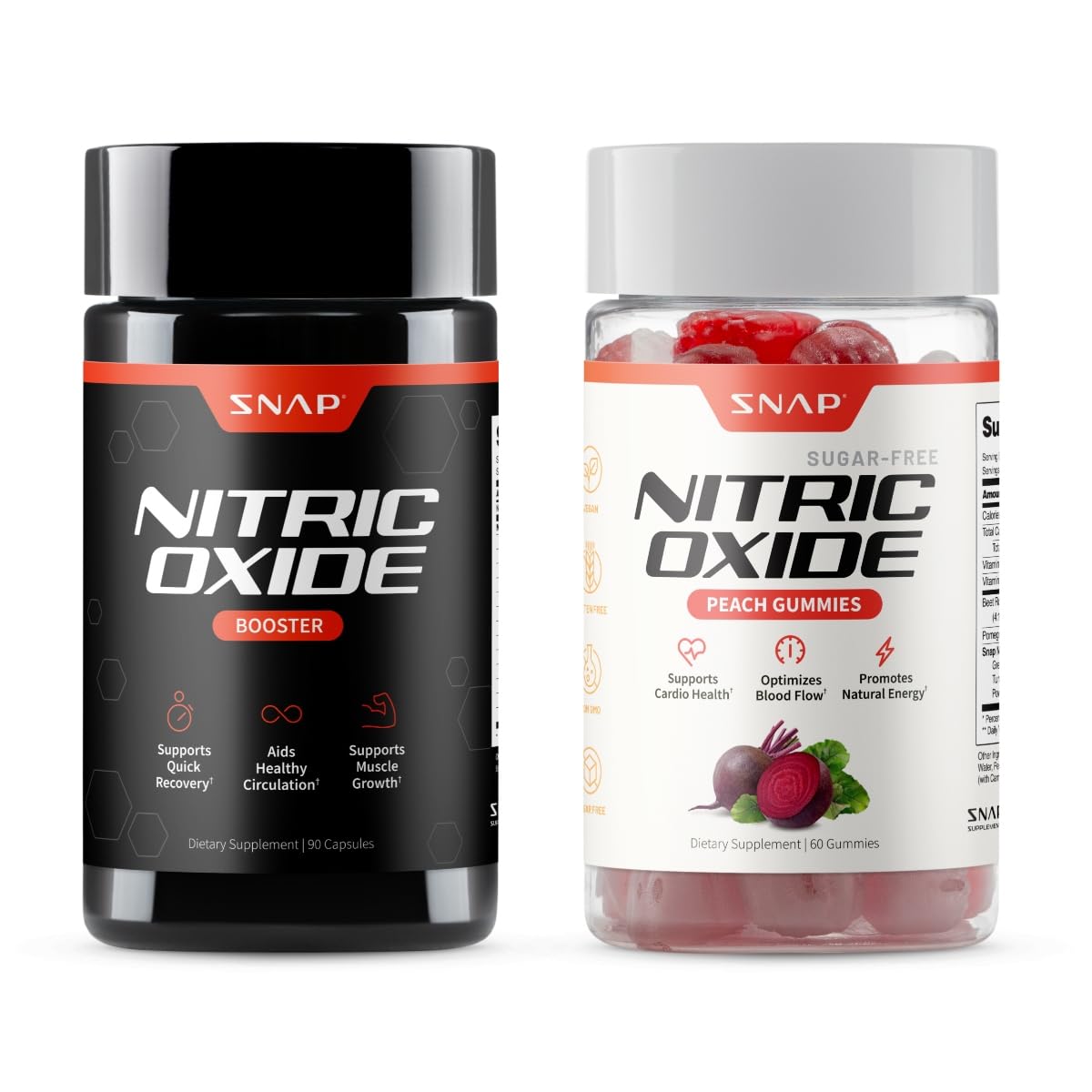 Snap Supplements Nitric Oxide Support Bundle — L-Arginine Capsules Peach Flavor Beet Root Gummies - Support circulation, endurance, and overall vitality with the Snap Supplements Nitric Oxide Support Bundle, featuring two complementary formulas designed to help maintain healthy nitric oxide levels and energy. This dual-format system combines L-Arginine Capsules and Nitric Oxide Peach Gummies for convenient, daily performance and wellness support. The Nitric Oxide Booster Capsules deliver three functional forms of L-Arginine, an amino acid that supports nitric oxide synthesis, circulation, and oxygen delivery throughout the body. Blended with traditional herbs such as Asian Ginseng, this formula helps support stamina, recovery, and vitality—ideal for active adults seeking natural, stimulant-free energy support. The Nitric Oxide Peach Gummies provide a delicious, plant-based option for maintaining healthy nitric oxide production. Each chew combines Beet Root and Pomegranate Juice Powder, two ingredients to help support circulation and energy as part of a balanced wellness routine. Designed for men and women who stay active, these vegan gummies fit seamlessly into workdays, workouts, and daily life—no mixing or measuring required. Together, these two nitric oxide supplements provide comprehensive support for energy metabolism and overall endurance. Perfect for athletes, professionals, and anyone looking to support circulation and vitality naturally as part of an active lifestyle. These statements have not been evaluated by the Food and Drug Administration. This product is not intended to diagnose, treat, cure, or prevent any disease.Quality You Can Trust: Snap Supplements products are developed by health experts and manufactured in the USA with globally sourced ingredients. Vegan, non-GMO, gluten-free, and produced in a GMP-certified facility to ensure purity, potency, and quality. Energy, Recovery Wellness Support: Together, these two formulas provide nutrients that help support endurance and muscle recovery. Designed to complement your workouts, workdays, and overall wellness routine naturally. Peach Flavor Nitric Oxide Gummies: These delicious gummies combine Beet Root and Pomegranate Juice Powder to help support circulation, energy, and daily vitality. A plant-based alternative to powders or drinks, ideal for busy, active adults seeking easy nitric oxide support on the go. L-Arginine Capsules for Circulation Vitality: The Nitric Oxide Booster Capsules feature three functional forms of L-Arginine, a key amino acid that helps support nitric oxide synthesis, healthy blood flow, and oxygen delivery. Infused with Asian Ginseng, this blend supports stamina, recovery, and daily performance. Dual-Action Nitric Oxide Support: This bundle combines Nitric Oxide Booster Capsules and Nitric Oxide Peach Gummies to help support healthy nitric oxide levels, circulation, and endurance. A convenient system for men and women seeking natural, stimulant-free energy support.