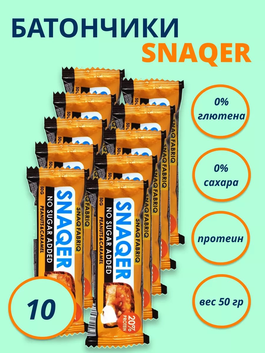 Батончик Snaqer арахис-карамель глазированный, 50г содержит на 100 г: 20 г белковых компонентов, 32 г жиров, 8 г углеводных элементов. Это протеиновый батончик с калорийностью 456 ккал на 100 г. В составе продукта присутствуют арахис, водорастворимые кукурузные волокна, олигофруктоза, молочный шоколад. Также батончик содержит натуральные ароматизаторы, подсластитель, воду, масло кокоса. Батончик станет отличным выбором для спортсменов, которым необходим дополнительный источник белка. Кроме того, батончик понравится любителям сладкого, которые придерживаются диетического питания – несмотря на отличный вкус, продукт содержит небольшое количество калорий.