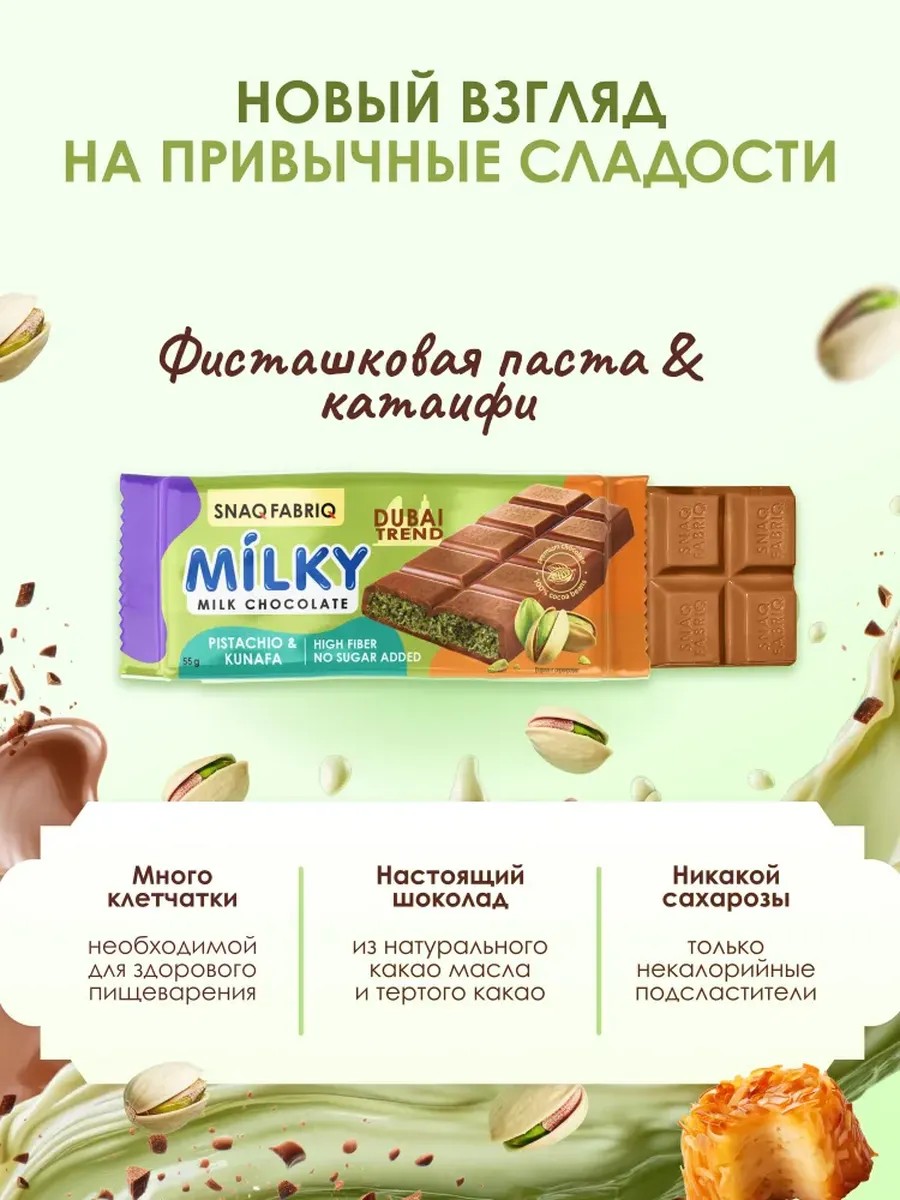 Новинка от SNAQ FABRIQ - Milky Dubai trend - это идеальное сочетание невероятного вкуса и заботы о своем здоровье. Настоящий продуктовый шедевр, вдохновленный Дубайским шоколадом.Нежный молочный шоколад полностью без сахара, заменяет традиционные десерты и обогащает питание пребиотиками и полезным кокосовым маслом. Без пальмового масла! Содержит клетчатку!Это вкусный и полезный шоколад без сахара батончик Милки! Невероятное наслаждение в каждом кусочке с нежным шоколадом и сливочной начинкой (как обычные сладости, но полезные) - и все без белого сахара.Что это за шоколад такой без сахара, да еще и со сливочной начинкой? Это Милки линейка шоколада от Snaq Fabriq! Вкусные шоколадки и такие нежные, из натурального тертого какао - полезные сладости и вкусняшки как для взрослых, так и для детей, отличные диетические продукты и конфеты без сахара от Snaq Fabriq!