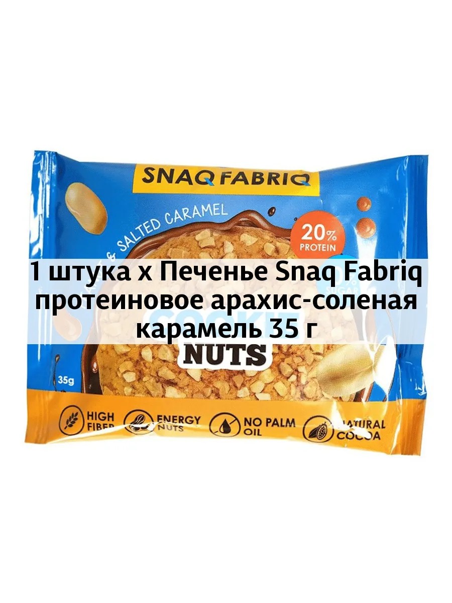 Weight: 35.0 g Flavor: Salted caramel Fat: 20.0 g Protein: 22.0 g Base: Protein Ingredients: Whey protein concentrate, peanuts, soluble corn fiber, oligofructose (dietary fiber from chicory), coconut oil, water, sweetener (erythritol), humectant (glycerin), salt, natural flavors, acidity regulators (sodium bicarbonate (baking soda), citric acid), emulsifier (soy lecithin), antioxidant (ascorbic acid), sweetener (sucralose), preservative (potassium sorbate). Carbohydrates: 13.0 g Cookie type: Protein Features: Mini packaging Packaging type: Plastic bag Product type: Cookies Caloric content: 367.0 kcal Shelf life: 9.0 months Storage conditions: At a temperature not exceeding +25°C Filling and additives: Peanuts Storage conditions 2: Avoid exposure to sunlight Note on the composition: Contains sweetener. Quantity per package: 1 pc Try the new nutty pleasure from Snaq Fabriq.