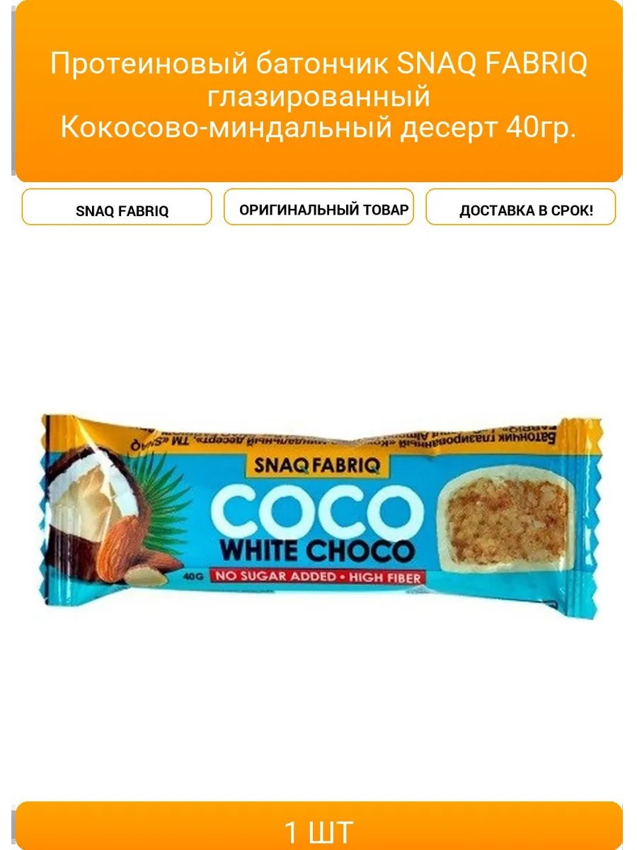 | Комплектация | Протеиновый батончик SNAQ FABRIQ глазированный Кокосово-миндальный десерт 40гр. |