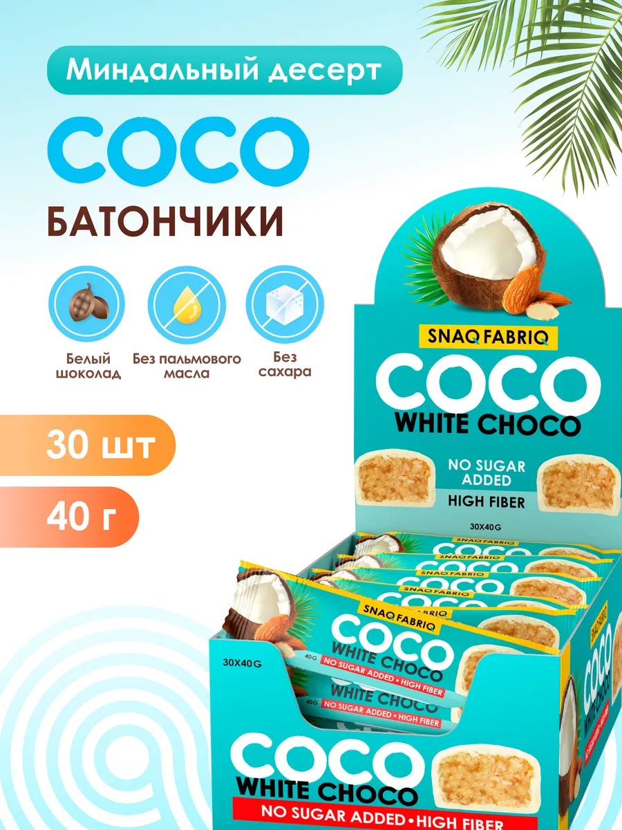 Кокосовый батончик COCO от SNAQ FABRIQ - это не просто правильные сладости, а настоящее полезное ПП удовольствие без вреда для фигуры! Десерт с начинкой из нежной мякоти кокоса, покрытый ароматным натуральным молочным шоколадом без сахара и пальмового масла. Этот диетический продукт можно использовать как здоровый перекус, ведь в нем так много клетчатки и минимум углеводов.