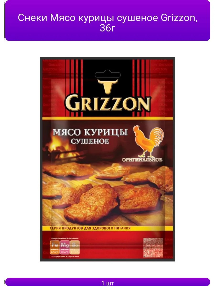 | Комплектация | Снеки Мясо курицы сушеное Grizzon, 36г |