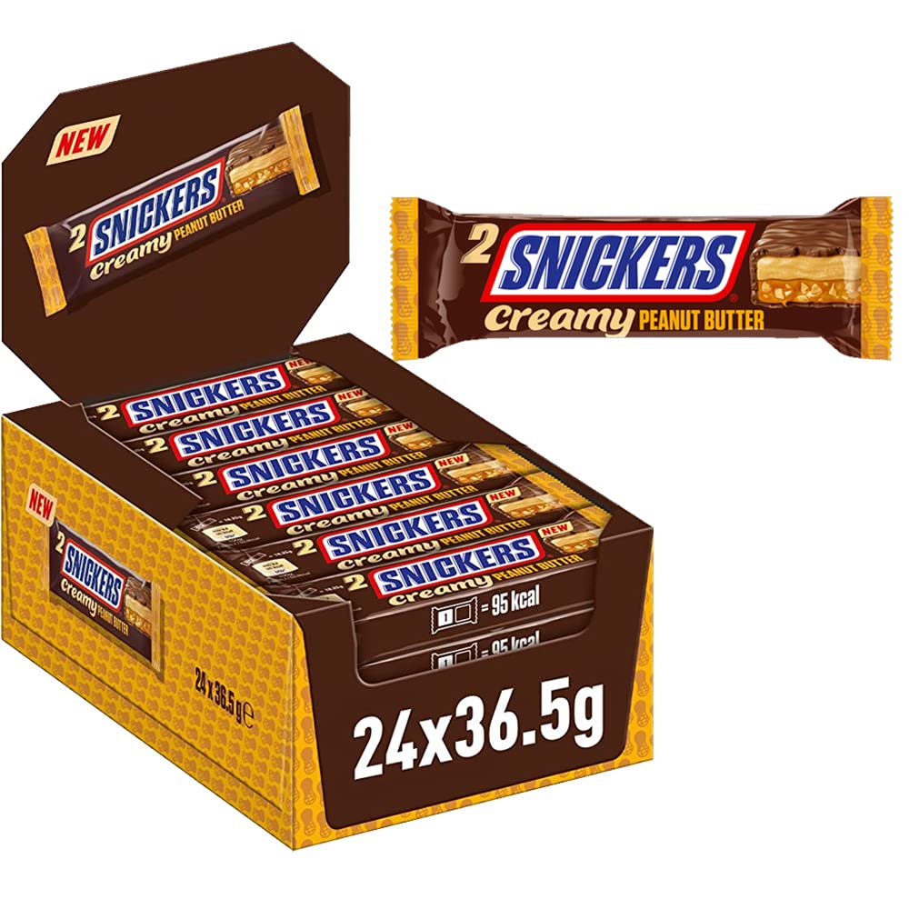 ?Snickers Creamy Peanut Butter Chocolate Duo Bar 36.5g ?Milk Chocolate with peanut butter filling & a caramel centre with fresh roasted peanuts ?2 bars in each pack ?Delicious milk Chocolate with a smooth velvety peanut butter filling and a caramel and fresh roasted peanut centre ?Perfect for sharing family & friends ?Ingredients - Peanuts, Sugar, Glucose Syrup, Skimmed Milk Powder, Cocoa Butter, Lactose, Invert Sugar, Cocoa Mass, Dextrose, Sunflower Oil, Whey Powder (from Milk), Milk Fat, Humectants (Glycerol, Sorbitol), Hydrogenated Soya Fat, Palm Fat, Salt, Emulsifier (Soya Lecithin), Antioxidant (E306), Starch, Natural Vanilla Extract.Milk Chocolate contains Milk Solids 14% minimum INGREDIENTS Peanuts, Sugar, Glucose Syrup, Skimmed Milk Powder, Cocoa Butter, Lactose, Invert Sugar, Cocoa Mass, Dextrose, Sunflower Oil, Whey Powder (from Milk), Milk Fat, Humectants (Glycerol, Sorbitol), Hydrogenated Soya Fat, Palm Fat, Salt, Emulsifier (Soya Lecithin), Antioxidant (E306), Starch, Natural Vanilla Extract.Milk Chocolate contains Milk Solids 14% minimum