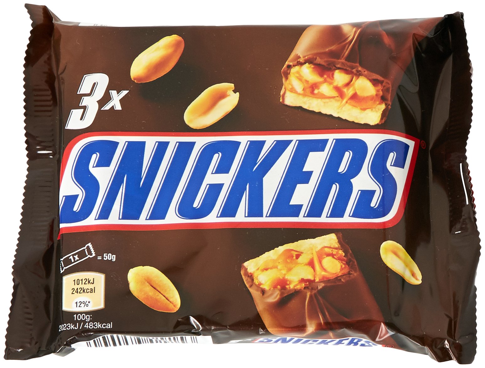 Milk chocolate filled with caramel and peanut confectionery. Chocolate bar. With peanuts. Bag of 3 bars. INGREDIENTS Sugar, glucose syrup, Peanuts, Skimmed milk powder, cocoa butter, cocoa mass, Lactose, sunflower oil, concentrated butter (Milk), whey powder, palm fat, salt, emulsifier (SOY lecithin), EGG white powder, coconut oil, hydrolyzed milk protein, natural vanilla extract. DIRECTIONS FOR USE Store between 13 and 22 SAFETY WARNING Consume promptly after opening. Individually wrapped bars to take anywhere! Each Snickers bar weighs 50g. Pack of 3 x 50g Snickers bars with peanuts and caramel. Chocolat au lait fourré de confiserie nappée de caramel et de cacahuètes. Barre chocolatée. Avec des cacahuètes. Sachet de 3 barres. INGRÉDIENTS Sucre, sirop de glucose, Cacahuètes, Lait écrémé en poudre, beurre de cacao, pâte de cacao, Lactose, huile de tournesol, beurre concentré (Lait), petit-Lait en poudre, matière grasse de palme, sel, émulsifiant (lécithine de Soja), blanc d'OEUF en poudre, huile de noix de coco, protéine de Lait hydrolysée, extrait naturel de vanille. MODE D'EMPLOI Conserver entre 13 et 22 AVERTISSEMENT DE SÛRETÉ Consommer rapidement après ouverture. Barres emballées individuellement à emporter partout !. Chaque barre Snickers pèse 50g. Paquet de 3 barres Snickers de 50g aux cacahuètes et au caramel.