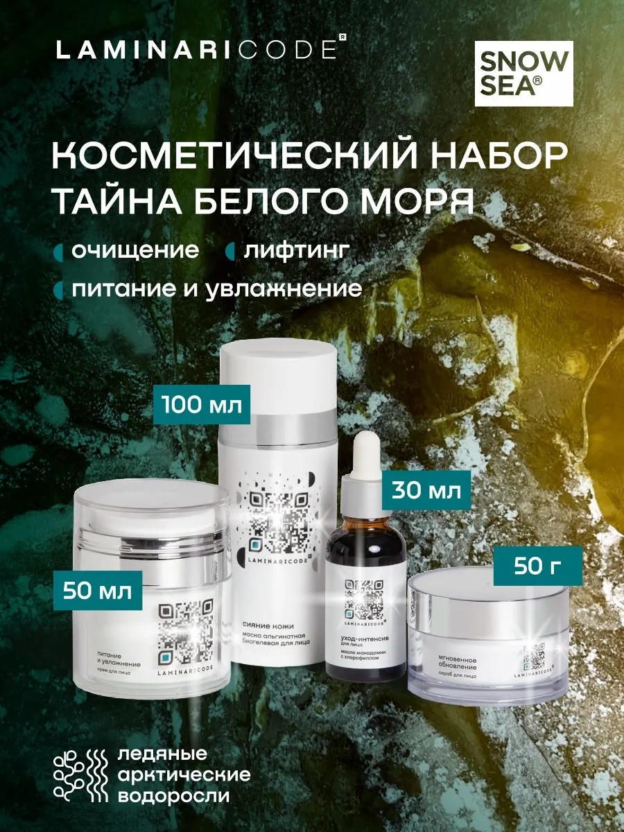Step 3 - Face Cream Nourishing and moisturizing. Improving skin elasticity. Laminaria extracts in the composition make it universal for any skin type. All cosmetic products from brown algae contain: a complex of macro- and microelements: potassium, calcium, sodium, magnesium, iodine, selenium, sulfur. silver, etc.; vitamins A1, B2, B3, B6, B12, C, D, E; 20 amino acids; chlorophyll derivatives; unsaturated fatty acids Omega-3 and Omega-6; alginates, fucoidan, carotenoids, laminaran. The "Secret of the White Sea" facial skin care set, 4 pieces, comes in a sturdy, transparent cosmetic bag with snap closures, making it easy to take with you on a trip or give as a gift.