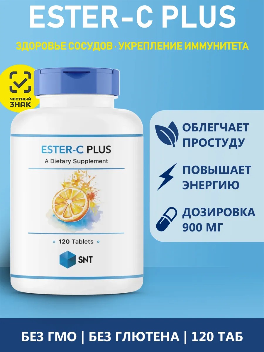 SNT Ester-C Plus — биологически активная добавка, содержащая витамин С в форме Ester-C — мягкой и легко усваиваемой для организма. В одной таблетке содержится 900 мг витамина С из аскорбата кальция, дополненного цитрусовыми биофлавоноидами, экстрактами ацеролы, шиповника и рутином.