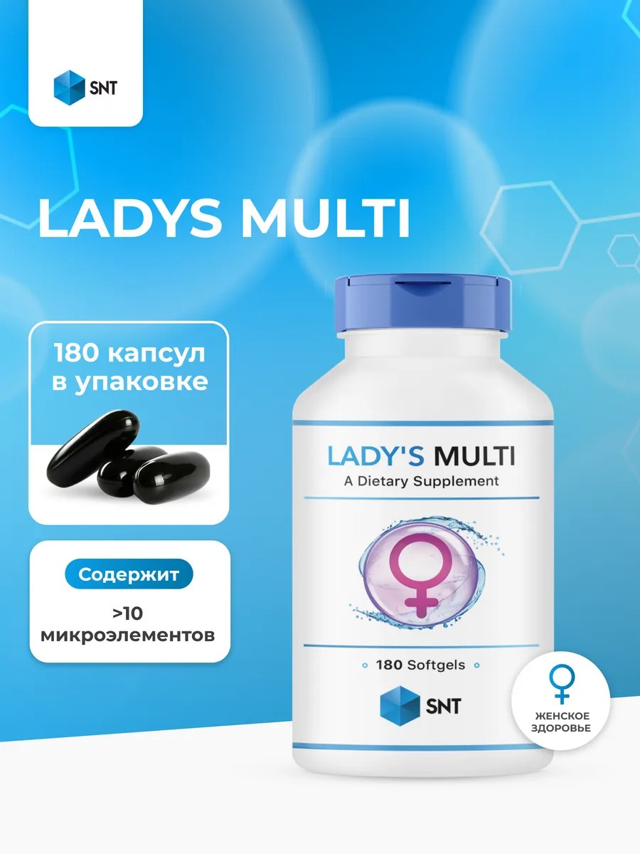 SNT Ladys Multi Лэдис мульти мультивитамины для женщин 180 капсул - cбалансированный витаминно-минеральный комплекс, созданный специально для женщин, служит для укрепления иммунитета, улучшения состояния кожи, ногтей и волос, в его составе присутствует полный спектр витаминов, необходимых для нормального функционирования женской гормональной системы, минералы в хелатных формах с отличной усвояемостью и большое количество антиоксидантов.Комплекс также обогащен натуральными растительными экстрактами и маслами (ALA, масло примулы вечерней, экстракты зеленого чая и виноградных косточек, инозитол, экстракт хвоща), стимулирующими правильную работу репродуктивной системы и обеспечивающими нормализацию обменных процессов организма.Большинство представительниц прекрасного пола ведут активный образ жизни. Работа, семья и личная жизнь, спорт, уход за телом требуют значительных временных и энергетических затрат. Более того, постоянная нехватка времени часто не позволяет полноценно питаться. Именно поэтому, женскому организму необходимо регулярно принимать витамины и минералы для сохранения здоровья, красоты, молодости и хорошего настроения.Комплекс богат антиоксидантами, которые просто необходимы для замедления процессов старения организма. Их основная работа заключается в нейтрализации и выведении свободных радикалов, что способствует разглаживанию морщин, улучшению состояния ногтей и волос. Также в комплекс дополнительно входят альфа-липоевая кислота и лютеин.Рекомендации по применению: Принимайте по 1 капсуле 3 раза в день во время или после еды.
