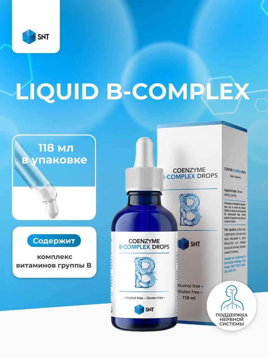 SNT Liquid B-Complex Комплекс витаминов B жидкий 118 мл - это мощная жидкая добавка, разработанная для поддержки энергии и общего здоровья. В составе комплекса – витамины группы B в коферментной форме, что обеспечивает их оптимальное усвоение и биодоступность. Жидкая форма добавки облегчает прием и обеспечивает быстрое поступление активных веществ в организм.• Высокая биодоступность: Жидкая форма и коферментные формы витаминов группы B обеспечивают максимально быстрое и полное усвоение питательных веществ.• Поддержка энергии: Витамины B1, B2, B3, B5, B6, B7, B9 и B12 играют ключевую роль в обменных процессах, помогая превращать пищу в энергию и поддерживать высокий уровень активности.• Укрепление нервной системы: Витамины группы B способствуют нормальному функционированию нервной системы, улучшая когнитивные функции и снижая уровень стресса.• Улучшение настроения: Витамины B6 и B12 помогают регулировать настроение и снижают риск развития депрессии.• Здоровье кожи, волос и ногтей: Биотин (B7) поддерживает здоровье кожи, способствует росту крепких волос и ногтей.• Поддержка иммунитета: Фолат (B9) и B12 играют важную роль в поддержке иммунной системы, способствуя выработке новых клеток.• Удобство и простота приема: Жидкая форма добавки легко дозируется и подходит для людей с трудностями при глотании таблетокРекомендации по применению: Принимайте по 1 порции в день.