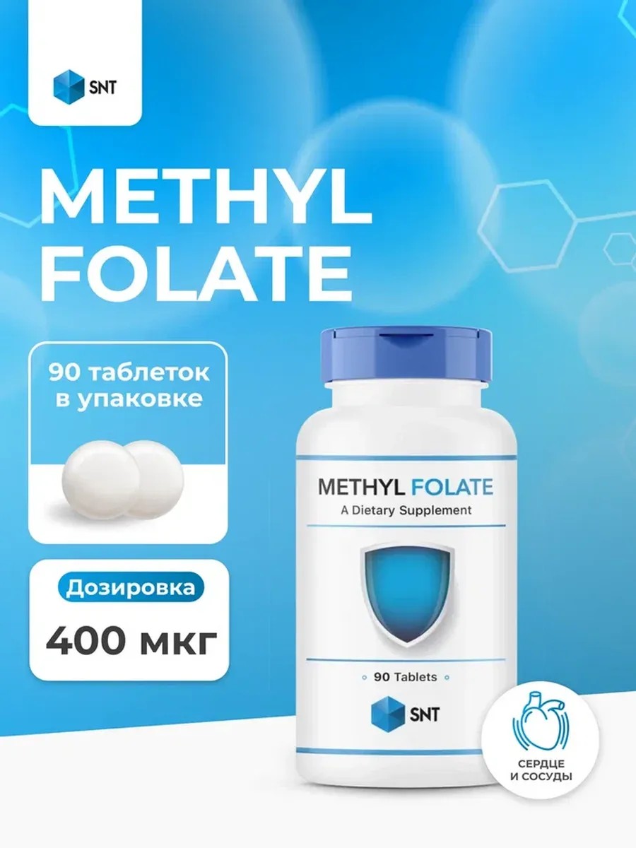SNT Methyl Folate Метилфолат, Фолиевая кислота 400 mcg 90 таблеток – это высококачественная пищевая добавка, содержащая активную форму фолиевой кислоты (метилфолат), которая обеспечивает максимальную биодоступность и усвоение организмом. Фолиевая кислота играет ключевую роль в поддержке здоровья клеток, нервной системы и синтезе ДНК.br/br/Метилфолат (метилфолат 400) – это биологически активная форма фолиевой кислоты, которая легко усваивается организмом и обеспечивает максимальную эффективность. Этот продукт идеально подходит для тех, кто ищет качественную поддержку своего здоровья.br/br/Methyl Folate 400 мкг – это надежный выбор среди витаминных добавок, доступных в аптеках, для поддержания общего здоровья и благополучия. Добавьте этот продукт в свой рацион и ощутите все преимущества метилфолата.br/br/Рекомендации по применению: Принимать по одной капсуле в день во время еды.