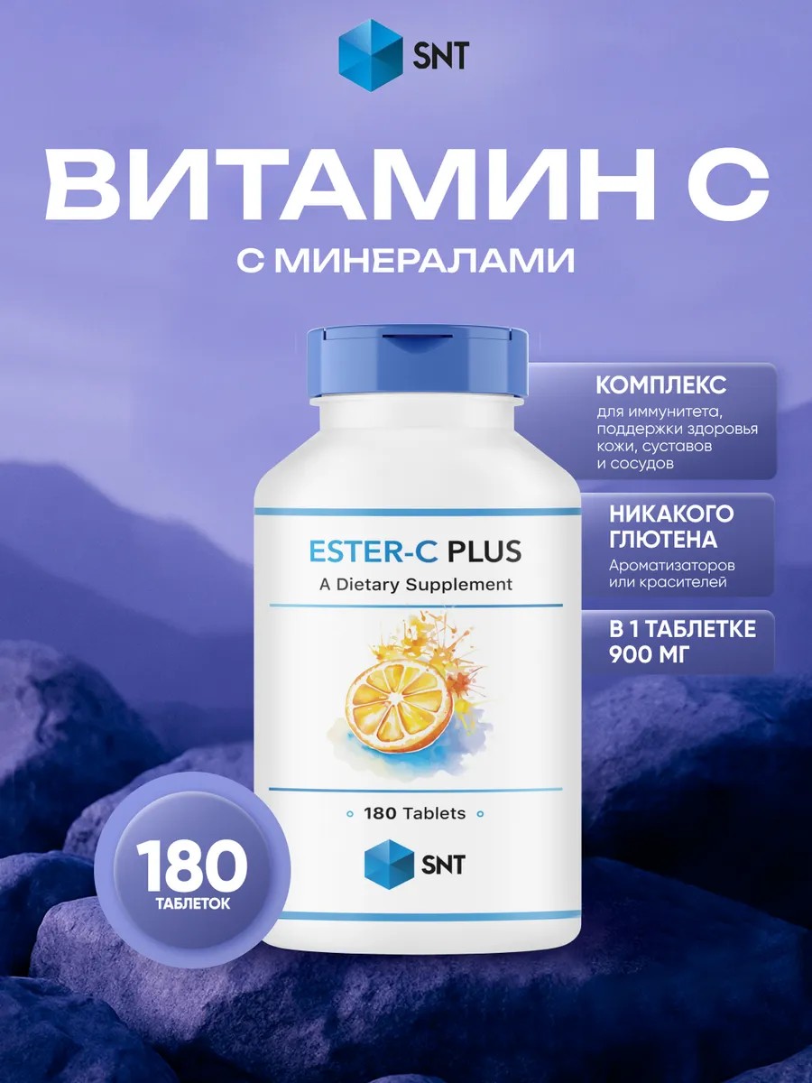 Витамин С от SNT — это мощный антиоксидант, необходимый организму для поддержания иммунитета, укрепления сосудов, выработки коллагена и защиты от свободных радикалов. Формула Ester-C Plus 1000 мг содержит стабильную форму витамина С с добавлением биофлавоноидов, что обеспечивает мягкое действие, длительное усвоение и усиленный эффект.