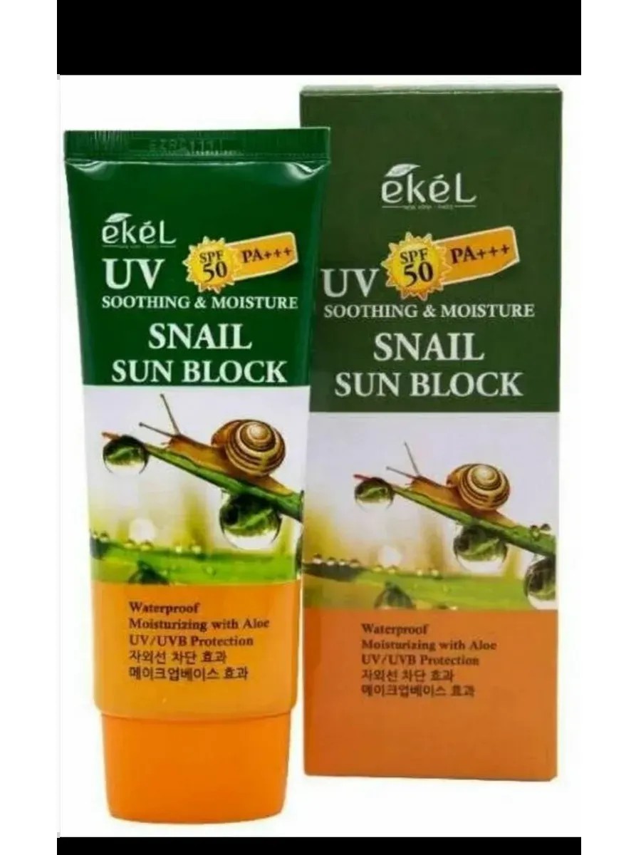 The Korean sunscreen EKEL Soothing & Moisture Sun Block SPF 50 Snail 70 ml with Snail Mucin will become an indispensable companion on your travels, vacations, any trip, and everyday life! Prepare for a safe and even tan with EKEL, which has a maximum SPF 50+ barrier, making it the best tanning cream for your body and face. The gel now contains next-generation UV filters to protect against the harmful effects of ultraviolet rays. The new 50SPF formula contains many natural and organic ingredients, such as snail secretion, which improve microcirculation and vascular tone, providing an anti-aging effect. It absorbs quickly without a sticky feeling, leaving no white marks. Alcohol-free. With maximum protection from UVA and UVB rays, Ekel prevents dehydration caused by spending time at the beach and outdoors. This moisturizing sunscreen cream, like sun protection with SPF 50 for the face, has a high index and is suitable for all skin types, including sensitive skin and natural blondes. The caring properties of snail secretion in the SPF 50 filter formula provide hydration and intense nourishment, increased firmness and elasticity, even skin tone, smoothed wrinkles, and reduced appearance of age spots. Korean professional cosmetics offer a variety of skincare products for beauty and health. Everyone knows that Korean beauty is primarily associated with the quality of the skin, its tone, and health. This SPF 50 face cream is universal and suitable for both women and men. Just remember to reapply it to your face and body throughout the day (preferably every two to three hours) and apply generously, using 1/3 teaspoon. This volume may seem too much, so you can divide the application into 2 stages: apply one layer, wait for it to sit, and then apply the second layer.