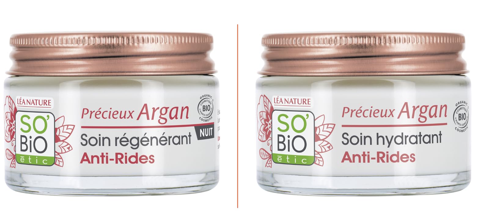 CONTENU 1 x Soin Hydratant Anti-Rides Jour - Précieux Argan - Flacon 50 ml 1 x Soin Régénérant Anti-rides Nuit - Précieux Argan - Flacon 50 ml. LES ENGAGEMENTS SO'BiO étic Une formulation respectueuse de la peau de et de la santé, en toute transparence. Un sourcing éthique, des emballages éco-conçus. Une production propre et 100 française. SO BiO étic reverse 1 de son chiffre d'affaires à la protection de la planète. Le Correcteur anti-cernes Teint Divin, testé sous contrôle dermatologique et formulé pour tous types de peaux, convient aux peaux sensibles. CONSEILS D'UTILISATION Appliquez chacun des deux soins sur l'ensemble du visage et du cou parfaitement nettoyés. RÉSULTATS Le Soin Hydratant Anti-Rides Jour hydrate intensément et instantanément la peau. Le Soin Régénérant Anti-Rides Nuit raffermit la peau. Jour après jour les rides sont lissées et réduites. La peau est plus tonique. ROUTINE VISAGE ANTI-RIDES À 99 d'origine naturelle, le Soin Hydratant anti-rides Jour et le Soin Régénérant anti-rides Nuit combattent les rides tout en respectant les mécanismes naturels de la peau. Les rides sont lissées, la peau est hydratée.